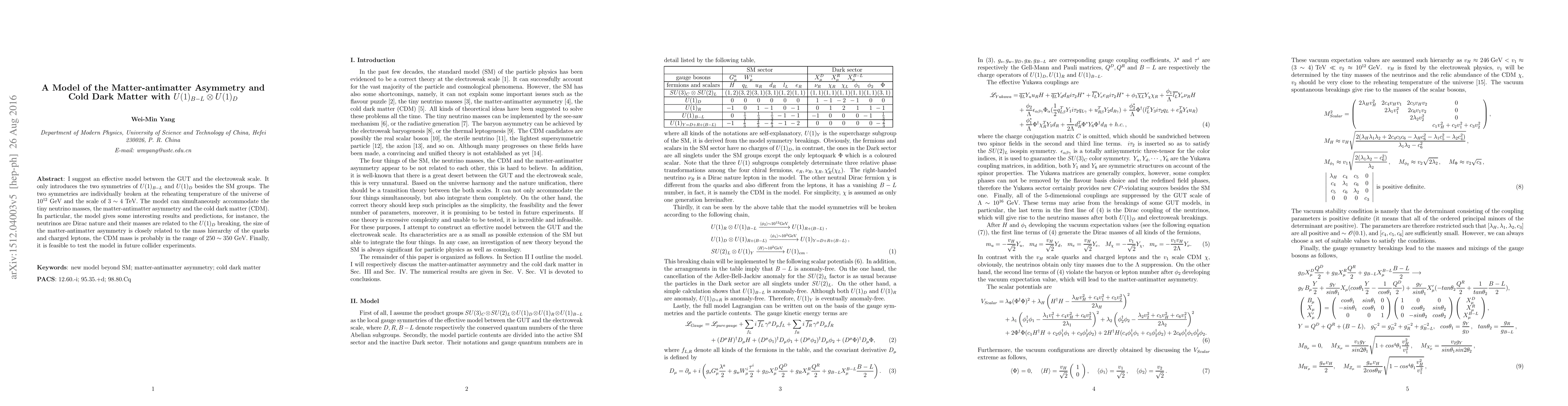I suggest an effective model between the GUT and the electroweak scale. It only introduces the two symmetries of $U(1)_{B-L}$ and $U(1)_{D}$ besides the SM groups. The two symmetries are individually broken at the reheating temperature of the universe of $10^{12}$ GeV and the scale of $3\sim 4$ TeV. The model can simultaneously accommodate the tiny neutrino masses, the matter-antimatter asymmetry and the cold dark matter (CDM). In particular, the model gives some interesting results and predictions, for instance, the neutrinos are Dirac nature and their masses are related to the $U(1)_{D}$ breaking, the size of the matter-antimatter asymmetry is closely related to the mass hierarchy of the quarks and charged leptons, the CDM mass is probably in the range of $250\sim 350$ GeV. Finally, it is feasible to test the model in future collider experiments.