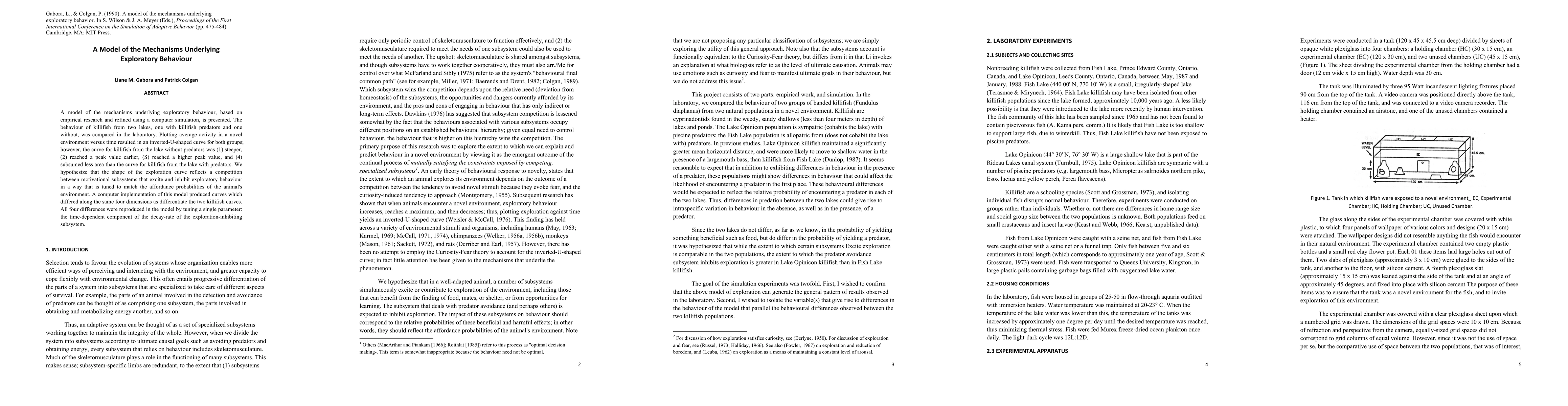 A model of the mechanisms underlying exploratory behaviour, based on empirical research and refined using a computer simulation, is presented. The behaviour of killifish from two lakes, one with killifish predators and one without, was compared in the laboratory. Plotting average activity in a novel environment versus time resulted in an inverted-U-shaped curve for both groups; however, the curve for killifish from the lake without predators was (1) steeper, (2) reached a peak value earlier, (S) reached a higher peak value, and (4) subsumed less area than the curve for killifish from the lake with predators. We hypothesize that the shape of the exploration curve reflects a competition between motivational subsystems that excite and inhibit exploratory behaviour in a way that is tuned to match the affordance probabilities of the animal's environment. A computer implementation of this model produced curves which differed along the same four dimensions as differentiate the two killifish curves. All four differences were reproduced in the model by tuning a single parameter: the time-dependent component of the decay-rate of the exploration-inhibiting subsystem.