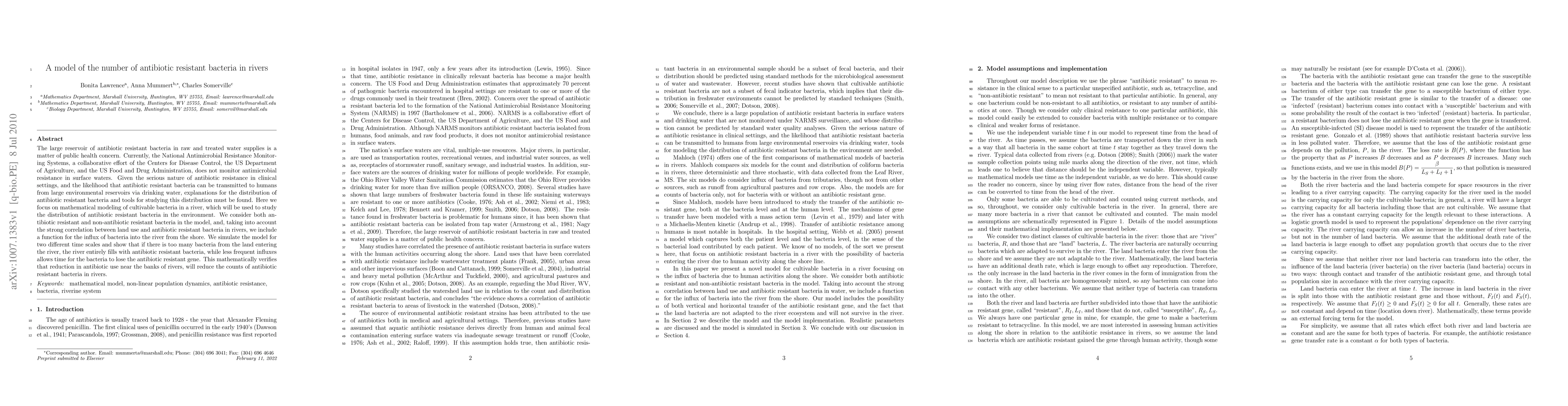 This paper develops a mathematical model to study the distribution of antibiotic resistant bacteria in rivers, considering both resistant and non-resistant bacteria. The model shows that reducing land-based bacterial influx can lower resistant bacteria counts, emphasizing the need for monitoring and controlling antibiotic use near river sources.