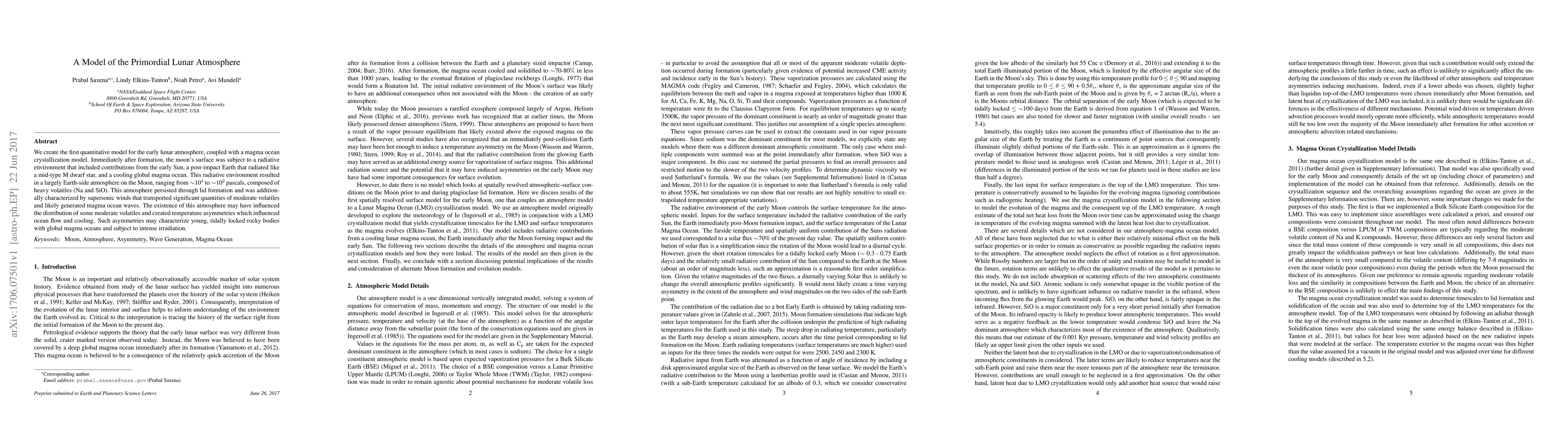 This paper presents the first quantitative model of the early lunar atmosphere, showing it was composed of heavy volatiles and persisted through magma ocean crystallization, influenced by intense irradiation from the early Sun and a post-impact Earth. This atmosphere may have affected the distribution of volatiles and created temperature asymmetries impacting magma ocean flow and cooling.