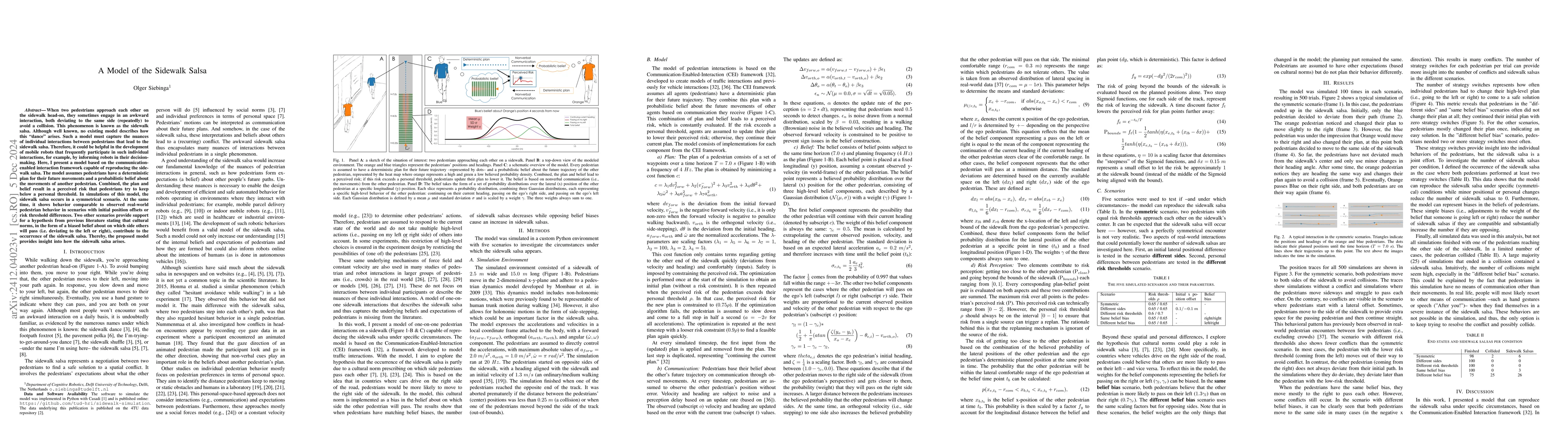 When two pedestrians approach each other on the sidewalk head-on, they sometimes engage in an awkward interaction, both deviating to the same side (repeatedly) to avoid a collision. This phenomenon is known as the sidewalk salsa. Although well known, no existing model describes how this "dance" arises. Such a model must capture the nuances of individual interactions between pedestrians that lead to the sidewalk salsa. Therefore, it could be helpful in the development of mobile robots that frequently participate in such individual interactions, for example, by informing robots in their decision-making. Here, I present a model based on the communication-enabled interaction framework capable of reproducing the sidewalk salsa. The model assumes pedestrians have a deterministic plan for their future movements and a probabilistic belief about the movements of another pedestrian. Combined, the plan and belief result in a perceived risk that pedestrians try to keep below a personal threshold. In simulations of this model, the sidewalk salsa occurs in a symmetrical scenario. At the same time, it shows behavior comparable to observed real-world pedestrian behavior in scenarios with initial position offsets or risk threshold differences. Two other scenarios provide support for a hypothesis from previous literature stating that cultural norms, in the form of a biased belief about on which side others will pass (i.e. deviating to the left or right), contribute to the occurrence of the sidewalk salsa. Thereby, the proposed model provides insight into how the sidewalk salsa arises.