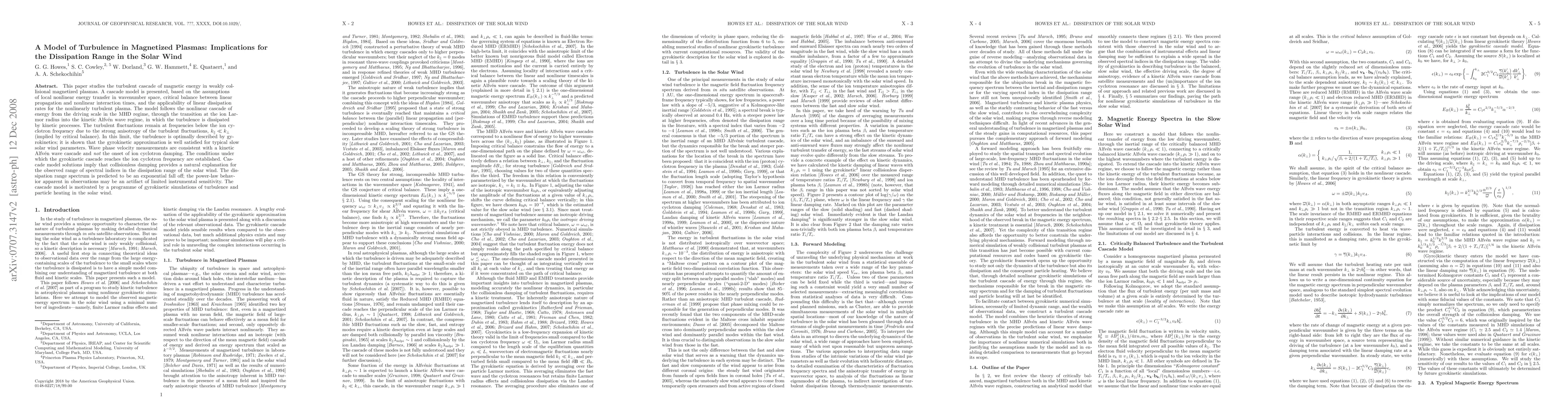 This paper develops a model for the turbulent cascade of magnetic energy in magnetized plasmas, showing that kinetic Alfven waves dissipate energy through collisionless damping, explaining the observed spectral indices in the solar wind's dissipation range. The gyrokinetic approximation is validated for typical solar wind conditions.