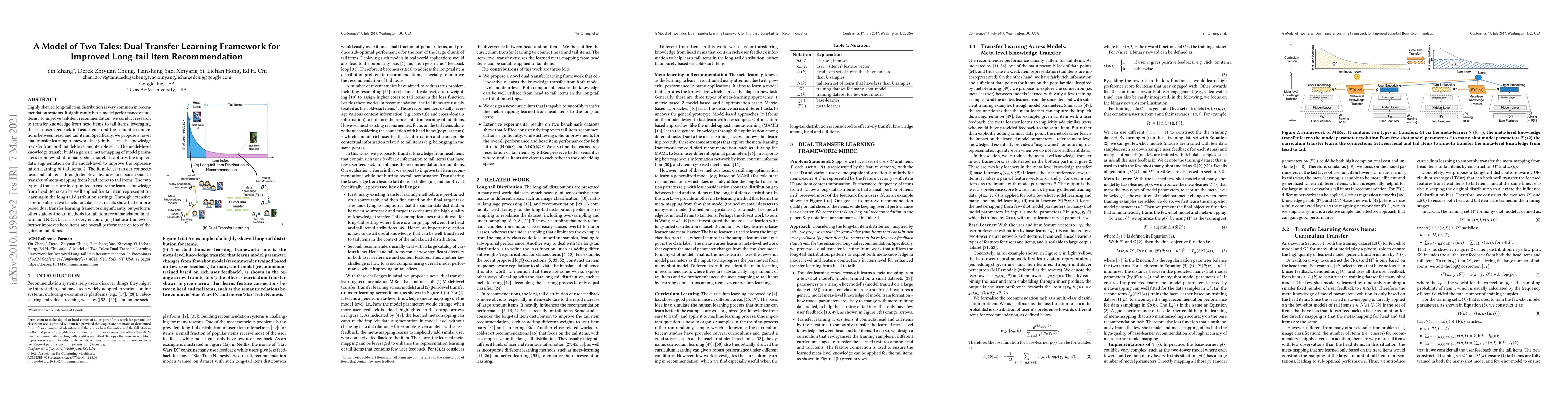 This paper proposes a dual transfer learning framework to enhance long-tail item recommendation by transferring knowledge from head items to tail items. The framework includes model-level and item-level knowledge transfer, significantly improving tail item recommendation performance and also benefiting head items and overall system performance.