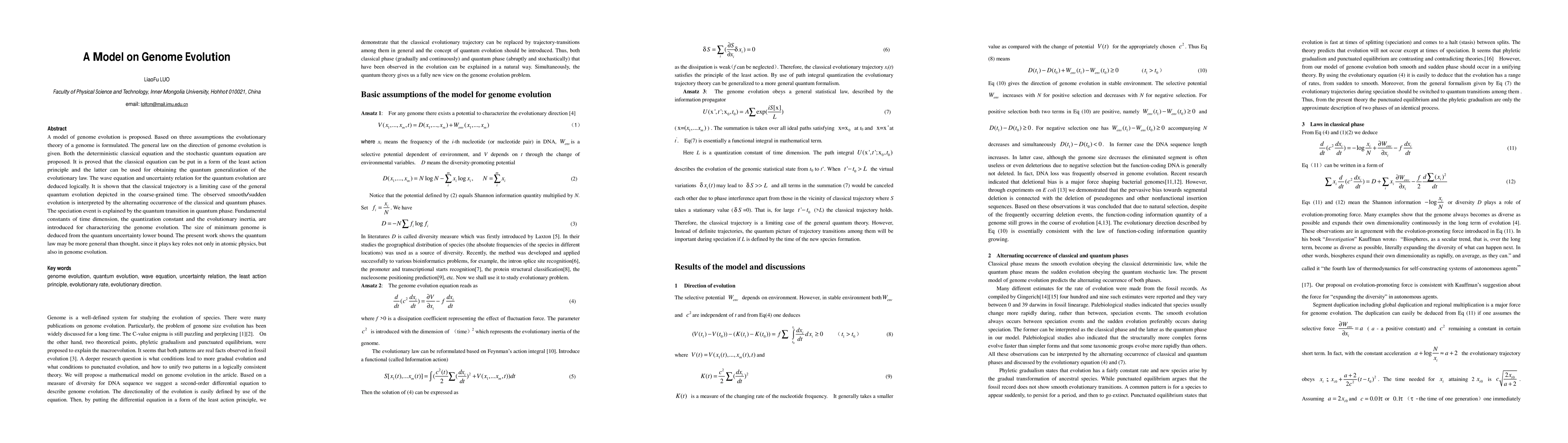 This paper proposes a model of genome evolution based on three fundamental assumptions, introducing both classical and quantum equations to describe evolutionary dynamics. It demonstrates that quantum principles underpin genome evolution, suggesting a quantum law may govern both atomic physics and biological processes.