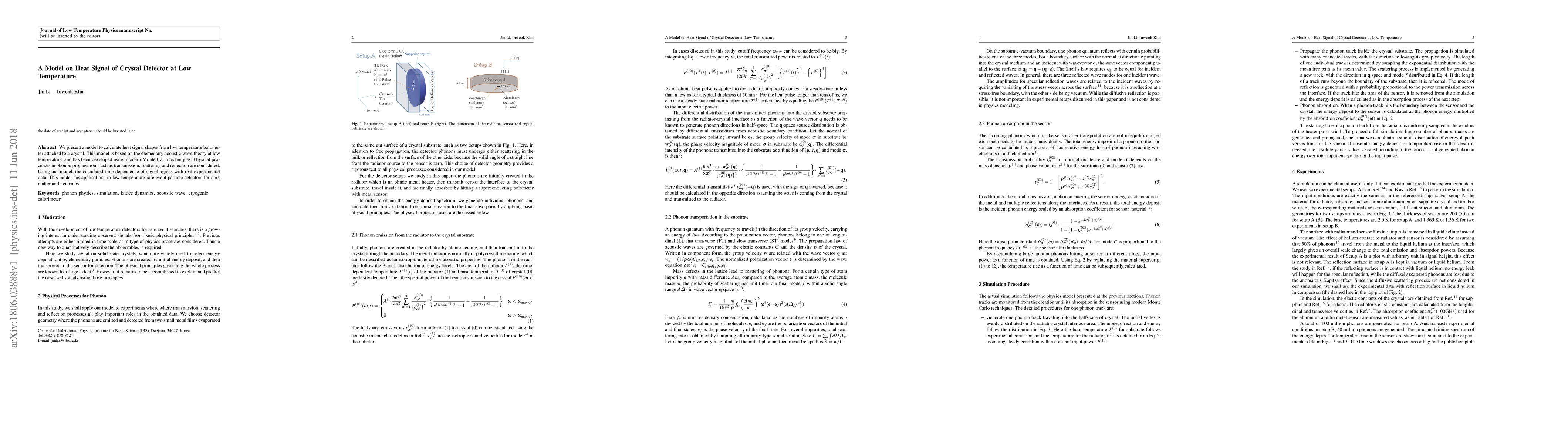 We present a model to calculate heat signal shapes from low temperature bolometer attached to a crystal. This model is based on the elementary acoustic wave theory at low temperature, and has been developed using modern Monte Carlo techniques. Physical processes in phonon propagation, such as transmission, scattering and reflection are considered. Using our model, the calculated time dependence of signal agrees with real experimental data. This model has applications in low temperature rare event particle detectors for dark matter and neutrinos.