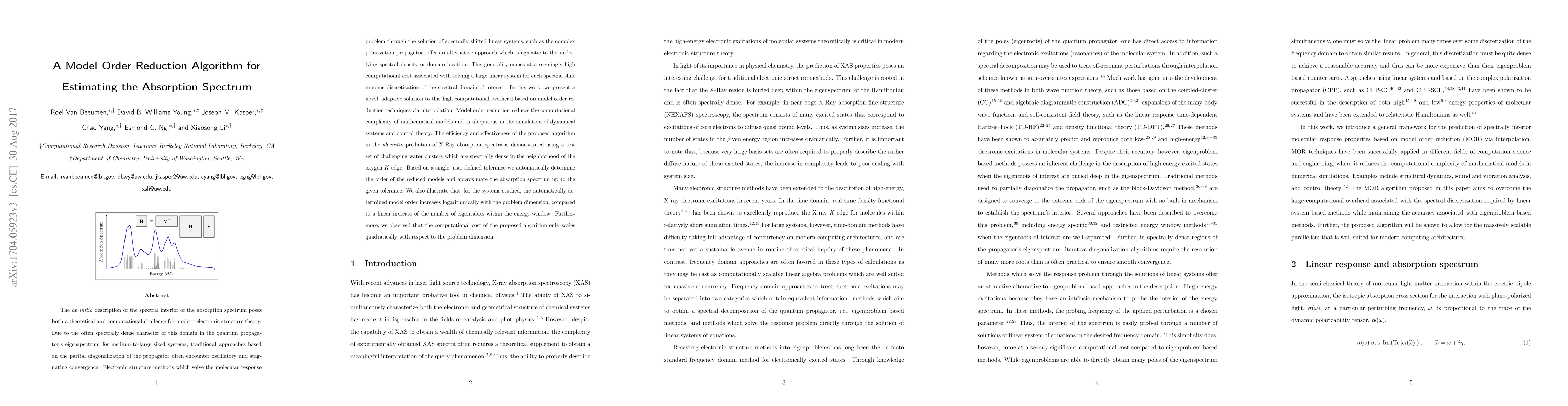 This paper introduces a novel algorithm for estimating X-Ray absorption spectra using model order reduction techniques. The method efficiently handles the computational challenges of spectral density in medium-to-large systems, demonstrating logarithmic growth in model order and quadratic scaling in computational cost with problem dimension. It's effectively validated using water clusters near the oxygen K-edge.