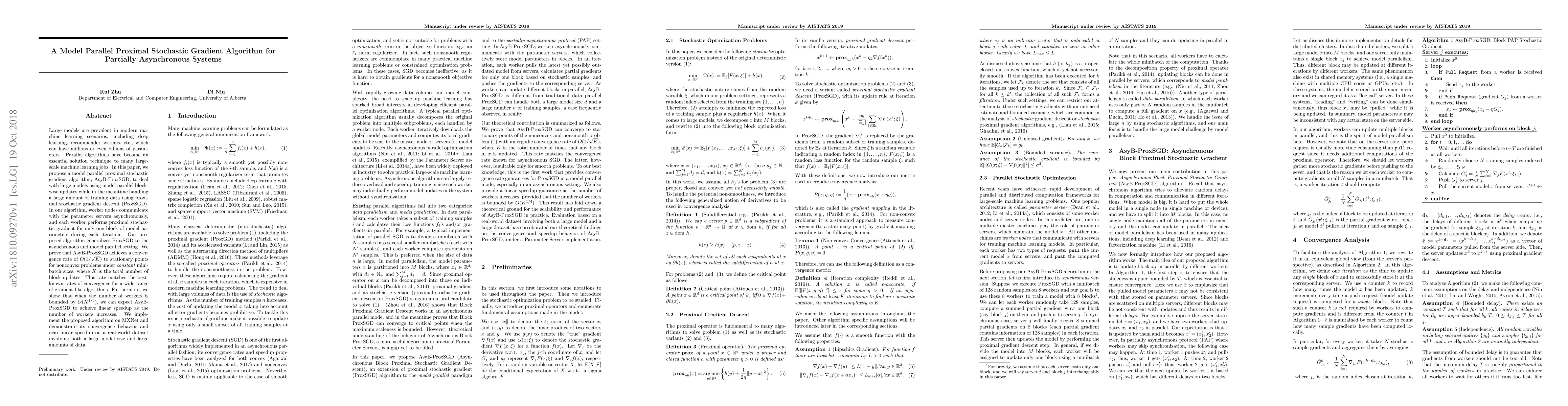 This paper proposes AsyB-ProxSGD, a model parallel proximal stochastic gradient algorithm for large-scale machine learning tasks, achieving $O(1/\sqrt{K})$ convergence for nonconvex problems. It demonstrates near-linear speedup with increasing workers and validates its effectiveness on a real-world dataset.