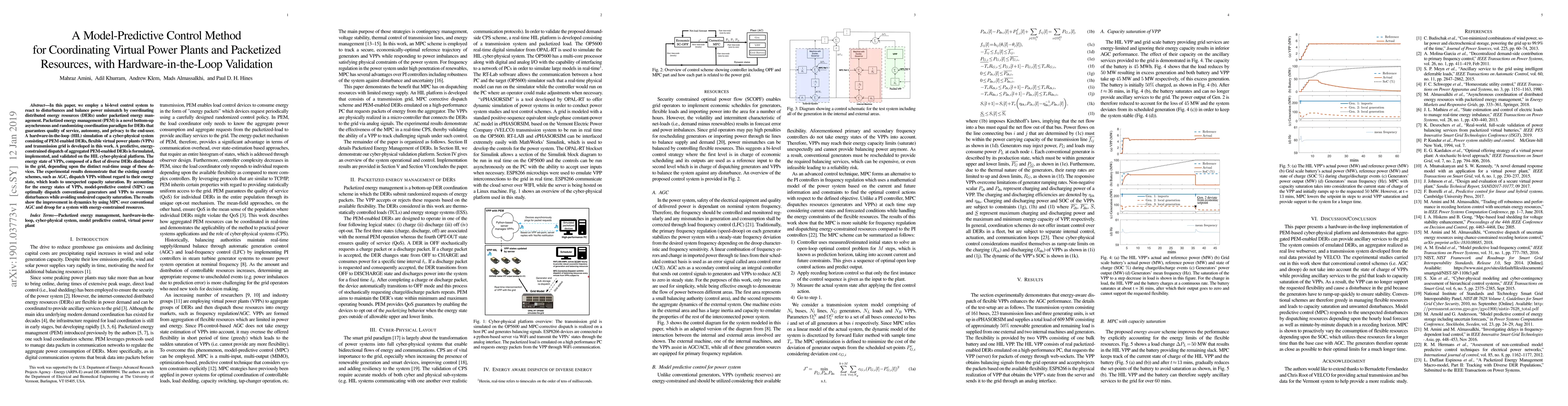 In this paper, we employ a bi-level control system to react to disturbances and balance power mismatch by coordinating distributed energy resources (DERs) under packetized energy management. Packetized energy management (PEM) is a novel bottom-up asynchronous and randomizing coordination paradigm for DERs that guarantees quality of service, autonomy, and privacy to the end-user. A hardware-in-the-loop (HIL) simulation of a cyber-physical system consisting of PEM enabled DERs, flexible virtual power plants (VPPs) and transmission grid is developed in this work. A predictive, energy-constrained dispatch of aggregated PEM-enabled DERs is formulated, implemented, and validated on the HIL cyber-physical platform. The energy state of VPPs, composed of a fleet of diverse DERs distributed in the grid, depending upon the distinct real-time usage of these devices. The experimental results demonstrate that the existing control schemes, such as AGC, dispatch VPPs without regard to their energy state, which leads to unexpected capacity saturation. By accounting for, the energy states of VPPs, model-predictive control (MPC) can optimally dispatch conventional generators and VPPs to overcome disturbances while avoiding undesired capacity saturation. The results show the improvement in dynamics by using MPC over conventional AGC and droop for a system with energy-constrained resource