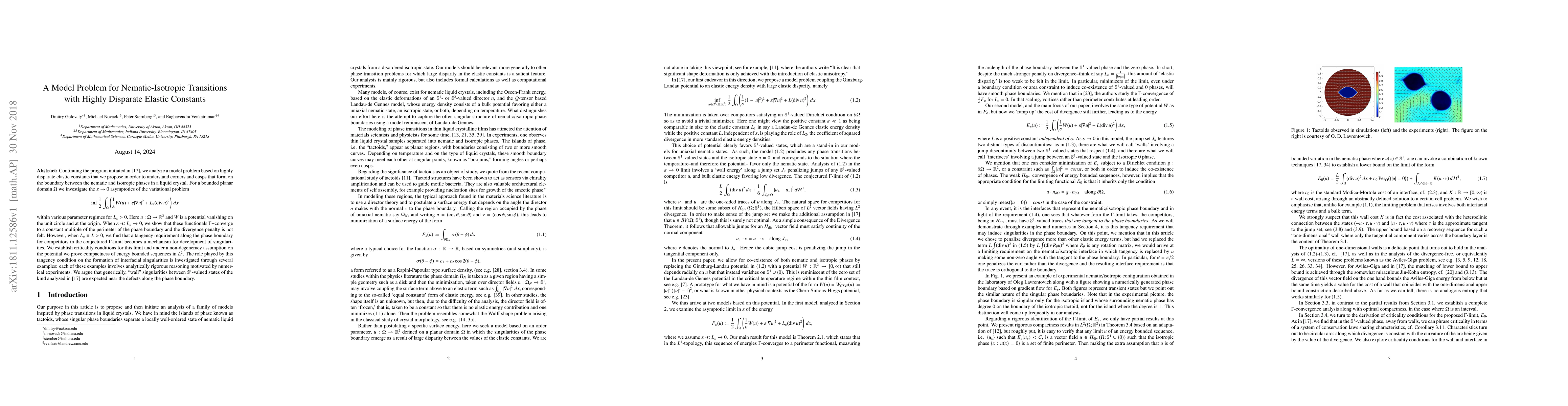 We analyze a model problem based on highly disparate elastic constants that we propose in order to understand corners and cusps that form on the boundary between the nematic and isotropic phases in a liquid crystal. For a bounded planar domain $\Omega$ we investigate the $\varepsilon \to 0$ asymptotics of the variational problem \[\inf \frac{1}{2}\int_\Omega \left( \frac{1}{\varepsilon} W(u)+\varepsilon |\nabla u|^2 + L_\varepsilon(\mathrm{div}\, u)^2 \right) \,dx\] within various parameter regimes for $L_\varepsilon > 0.$ Here $u:\Omega\to\mathbb{R}^2$ and $W$ is a potential vanishing on the unit circle and at the origin. When $\varepsilon\ll L_\varepsilon\to 0$, we show that these functionals $\Gamma-$converge to a constant multiple of the perimeter of the phase boundary and the divergence penalty is not felt. However, when $L_\varepsilon \equiv L > 0$, we find that a tangency requirement along the phase boundary for competitors in the conjectured $\Gamma$-limit becomes a mechanism for development of singularities. We establish criticality conditions for this limit and under a non-degeneracy assumption on the potential we prove compactness of energy bounded sequences in $L^2$. The role played by this tangency condition on the formation of interfacial singularities is investigated through several examples: each of these examples involves analytically rigorous reasoning motivated by numerical experiments. We argue that generically, "wall" singularities between $\mathbb{S}^1$-valued states are expected near the defects along the phase boundary.