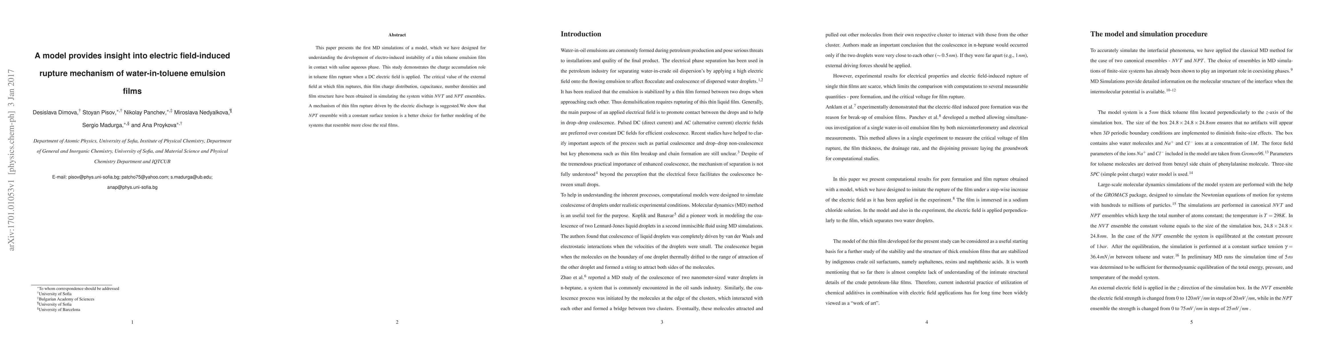 This paper presents the first MD simulations of a model, which we have designed for understanding the development of electro-induced instability of a thin toluene emulsion film in contact with saline aqueous phase. This study demonstrates the charge accumulation role in toluene film rupture when a DC electric field is applied. The critical value of the external field at which film ruptures, thin film charge distribution, capacitance, number densities and film structure have been obtained in simulating the system within NVT and NPT ensembles. A mechanism of thin film rupture driven by the electric discharge is suggested.We show that NPT ensemble with a constant surface tension is a better choice for further modeling of the systems that resemble more close the real films.