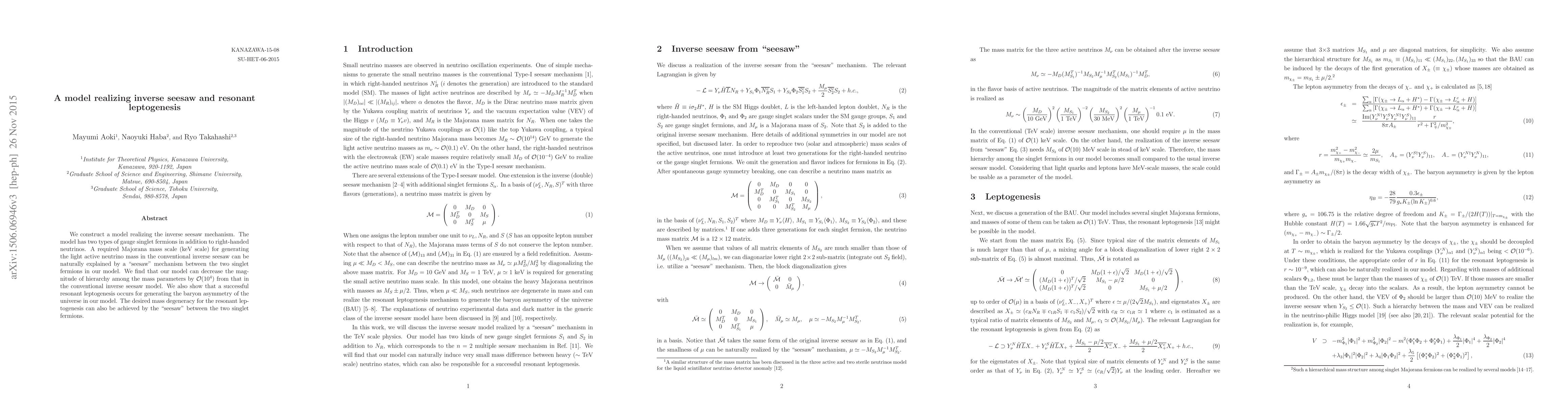 This paper proposes a model implementing the inverse seesaw mechanism with two types of gauge singlet fermions, explaining a keV-scale Majorana mass through a "seesaw" interaction. It demonstrates a significant reduction in mass parameter hierarchy and achieves resonant leptogenesis for generating the baryon asymmetry of the universe.