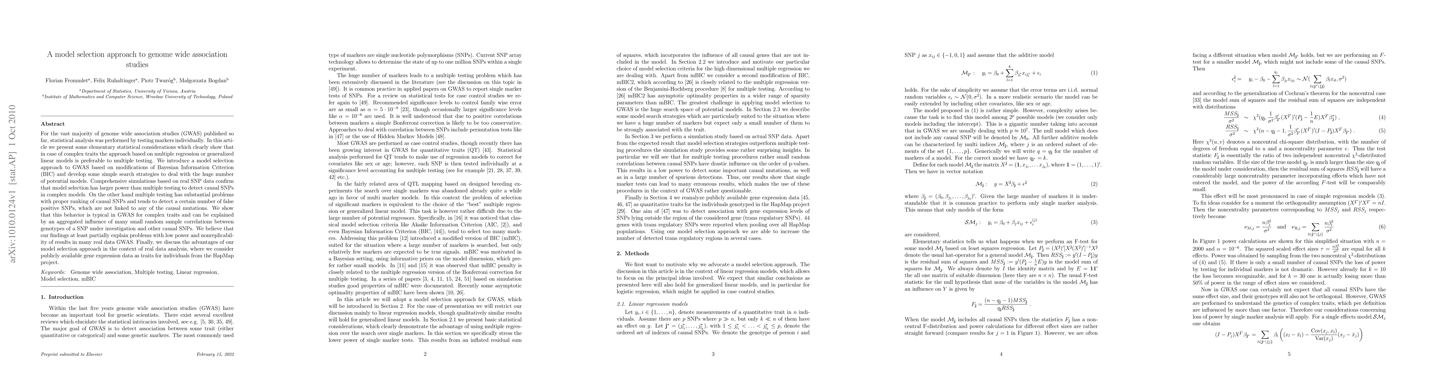 For the vast majority of genome wide association studies (GWAS) published so far, statistical analysis was performed by testing markers individually. In this article we present some elementary statistical considerations which clearly show that in case of complex traits the approach based on multiple regression or generalized linear models is preferable to multiple testing. We introduce a model selection approach to GWAS based on modifications of Bayesian Information Criterion (BIC) and develop some simple search strategies to deal with the huge number of potential models. Comprehensive simulations based on real SNP data confirm that model selection has larger power than multiple testing to detect causal SNPs in complex models. On the other hand multiple testing has substantial problems with proper ranking of causal SNPs and tends to detect a certain number of false positive SNPs, which are not linked to any of the causal mutations. We show that this behavior is typical in GWAS for complex traits and can be explained by an aggregated influence of many small random sample correlations between genotypes of a SNP under investigation and other causal SNPs. We believe that our findings at least partially explain problems with low power and nonreplicability of results in many real data GWAS. Finally, we discuss the advantages of our model selection approach in the context of real data analysis, where we consider publicly available gene expression data as traits for individuals from the HapMap project.