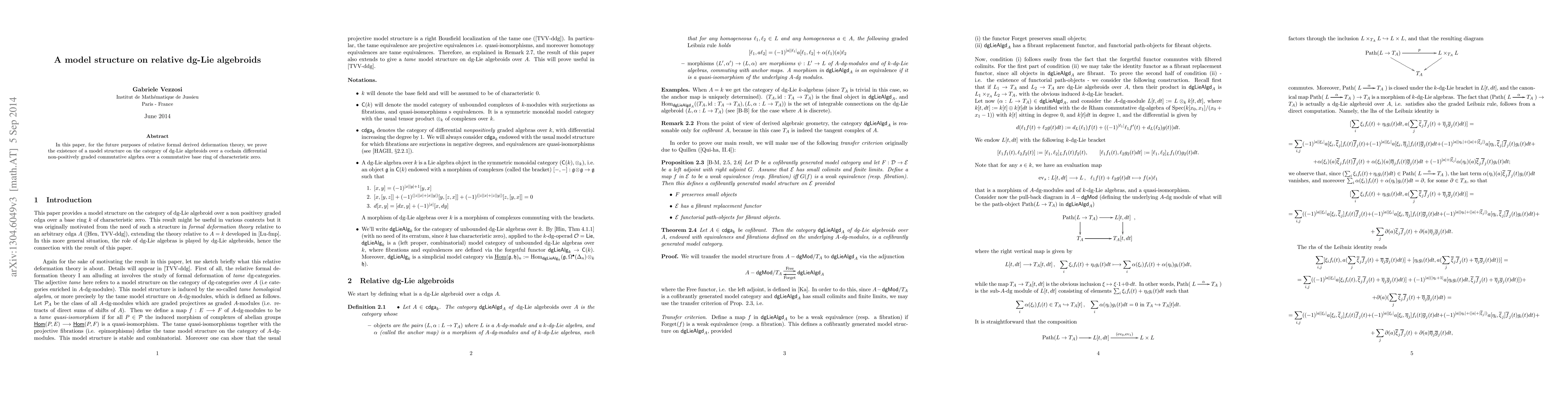 This paper establishes a model structure on the category of dg-Lie algebroids over a specific type of algebra, paving the way for future developments in relative formal derived deformation theory and derived coisotropic structures. The focus is on the algebraic framework over a characteristic 0 base ring.