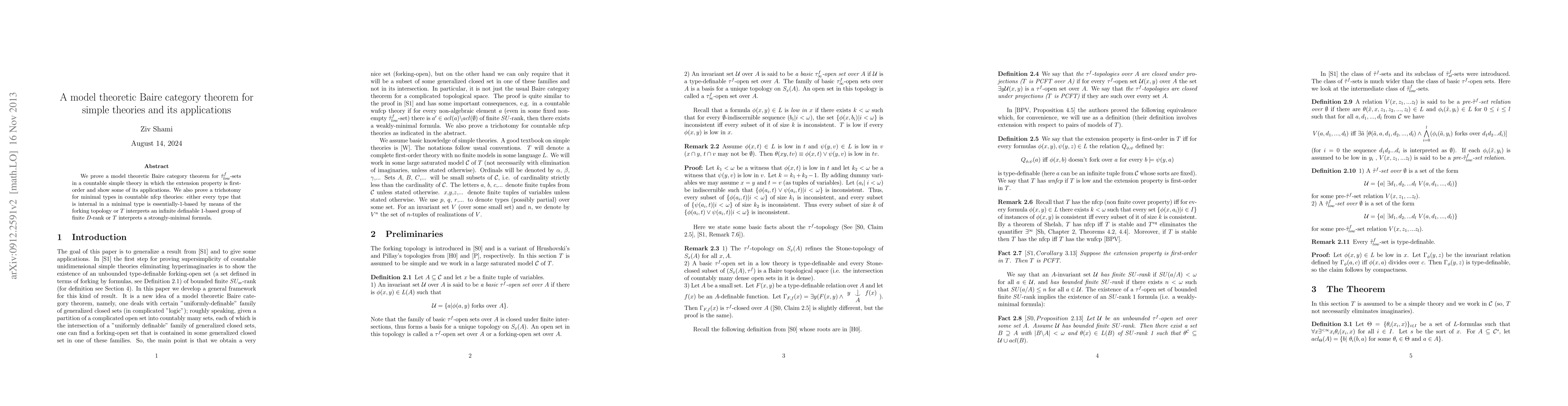 This paper proves a model-theoretic Baire category theorem for $\tilde\tau_{low}^f$-sets in countable simple theories, demonstrating its applications and establishing a trichotomy for minimal types in countable nfcp theories.