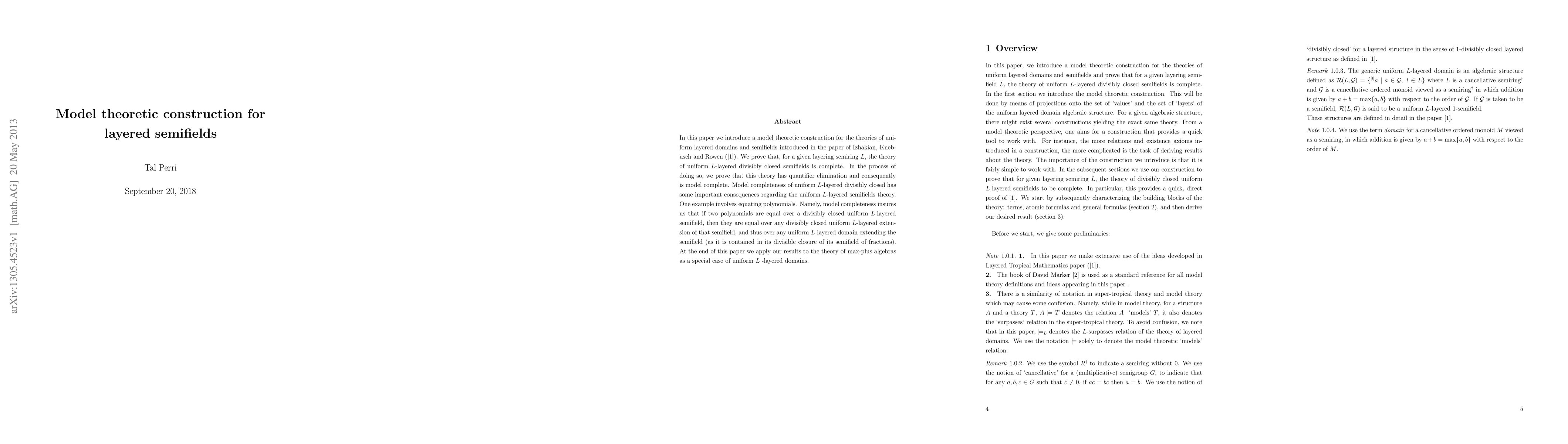 In this paper we introduce a model theoretic construction for the theories of uniform layered domains and semifields introduced in the paper of Izhakian, Knebusch and Rowen. We prove that, for a given layering semiring L, the theory of uniform L-layered divisibly closed semifields is complete. In the process of doing so, we prove that this theory has quantifier elimination and consequently is model complete. Model completeness of uniform L-layered divisibly closed has some important consequences regarding the uniform L-layered semifields theory. One example involves equating polynomials. Namely, model completeness insures us that if two polynomials are equal over a divisibly closed uniform L-layered semifield, then they are equal over any divisibly closed uniform L-layered extension of that semifield, and thus over any uniform L-layered domain extending the semifield (as it is contained in its divisible closure of its semifield of fractions). At the end of this paper we apply our results to the theory of max-plus algebras as a special case of uniform L -layered domains.