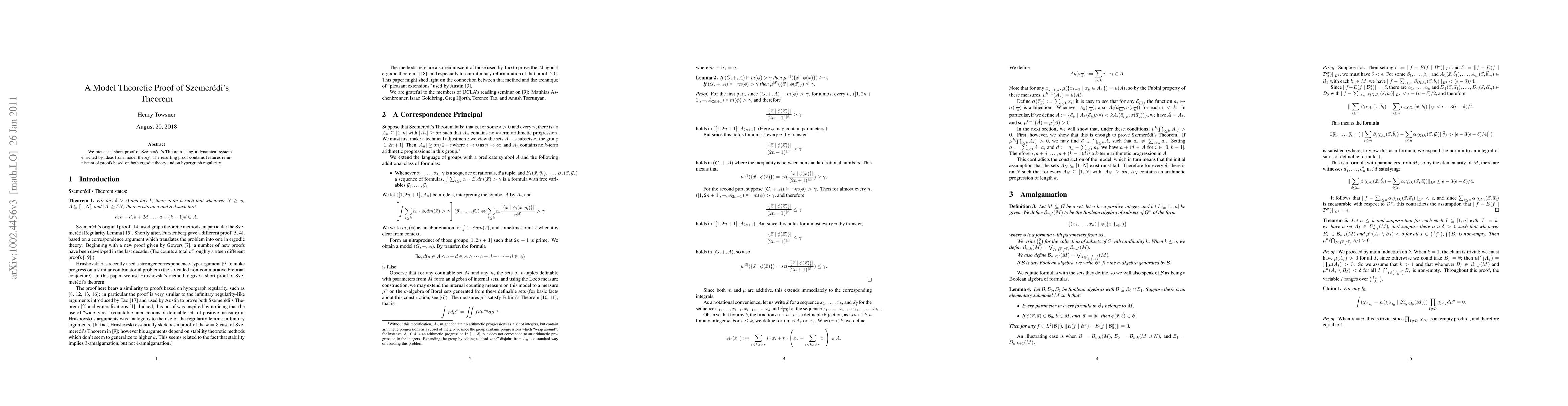 This paper provides a concise proof of Szemerédi's Theorem leveraging model theory and dynamical systems, combining elements from ergodic theory and hypergraph regularity. The approach offers a novel synthesis of these mathematical frameworks.