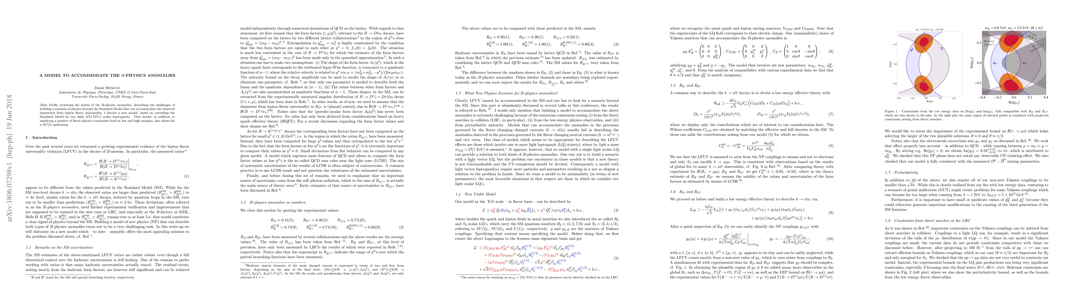 After briefly reviewing the status of the $B$-physics anomalies, describing the challenges of building a scenario of physics beyond the Standard Model that can accommodate the observed departures from lepton flavor universality, I discuss a new model, based on extending the Standard Model by two light [$\mathcal{O}(1\,\mathrm{TeV})$] scalar leptoquarks. That model, in addition to satisfying a number of flavor physics constraints both at low and high energies, also allows for a $SU(5)$ unification.