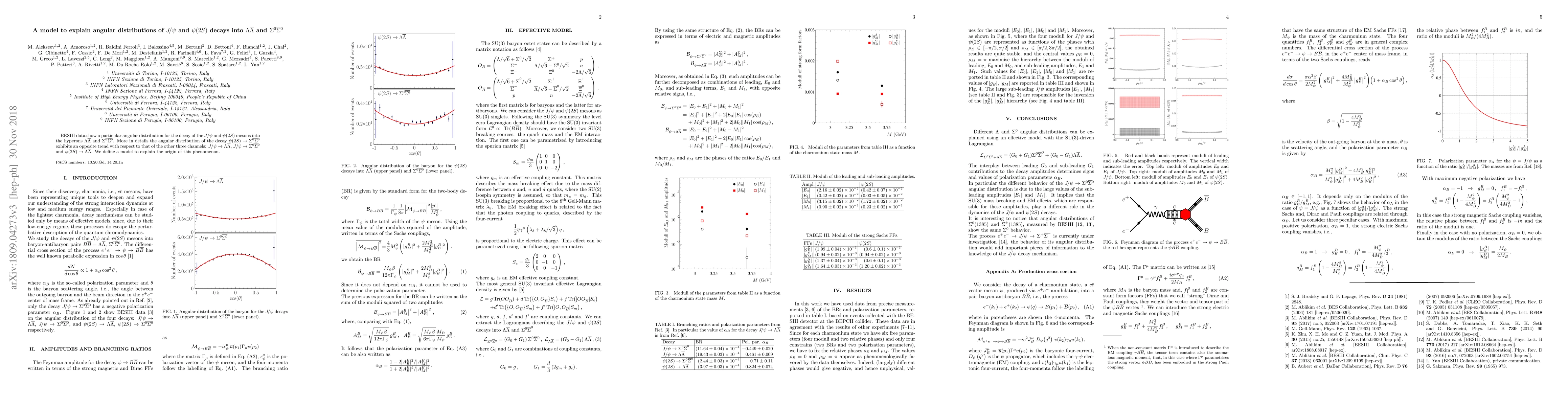 BESIII data show a particular angular distribution for the decay of the $J/\psi$ and $\psi(2S)$ mesons into the hyperons $\Lambda\overline{\Lambda}$ and $\Sigma^0\overline{\Sigma}^0$. More in details the angular distribution of the decay $\psi(2S) \to \Sigma^0\overline{\Sigma}^0$ exhibits an opposite trend with respect to that of the other three channels: $J/\psi \to \Lambda\overline{\Lambda}$, $J/\psi \to \Sigma^0\overline{\Sigma}^0$ and $\psi(2S) \to \Lambda\overline{\Lambda}$. We define a model to explain the origin of this phenomenon.
