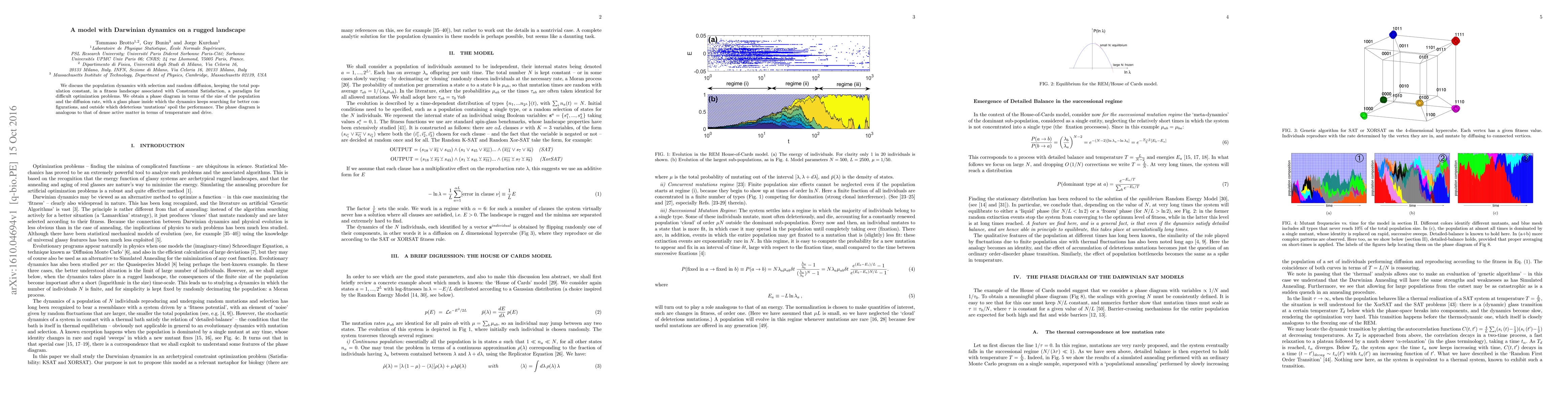 Researchers studied population dynamics with selection and random diffusion in a fitness landscape, finding a phase diagram that explains how the dynamics searches for better configurations and can become stuck in a 'glass' phase.