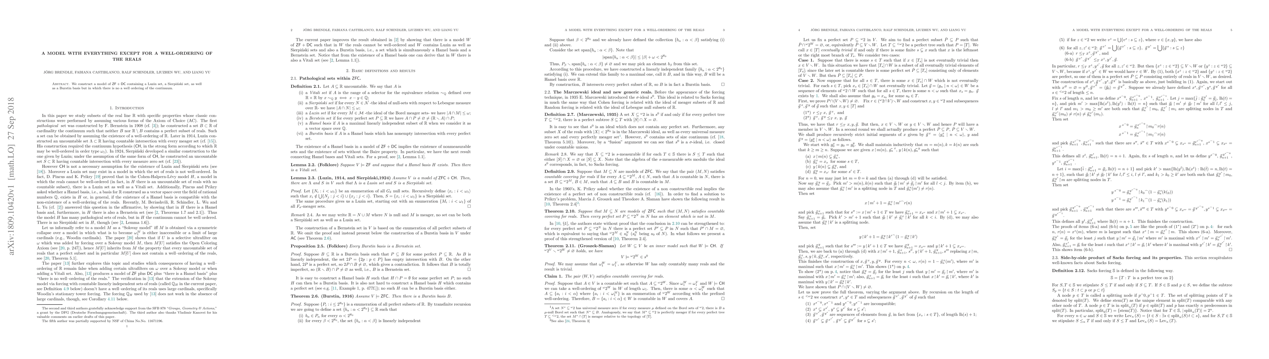 A model is constructed that contains popular set-theoretic objects like Luzin sets and Sierpiński sets but lacks a well-ordering of the continuum, challenging our understanding of large cardinal axioms.