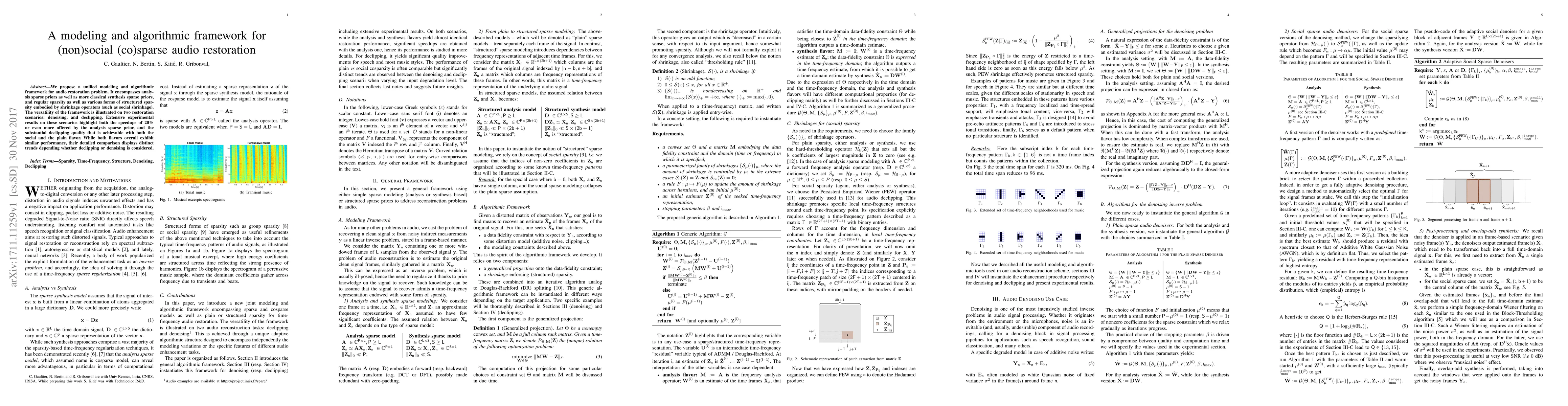 We propose a unified modeling and algorithmic framework for audio restoration problem. It encompasses analysis sparse priors as well as more classical synthesis sparse priors, and regular sparsity as well as various forms of structured sparsity embodied by shrinkage operators (such as social shrinkage). The versatility of the framework is illustrated on two restoration scenarios: denoising, and declipping. Extensive experimental results on these scenarios highlight both the speedups of 20% or even more offered by the analysis sparse prior, and the substantial declipping quality that is achievable with both the social and the plain flavor. While both flavors overall exhibit similar performance, their detailed comparison displays distinct trends depending whether declipping or denoising is considered.
