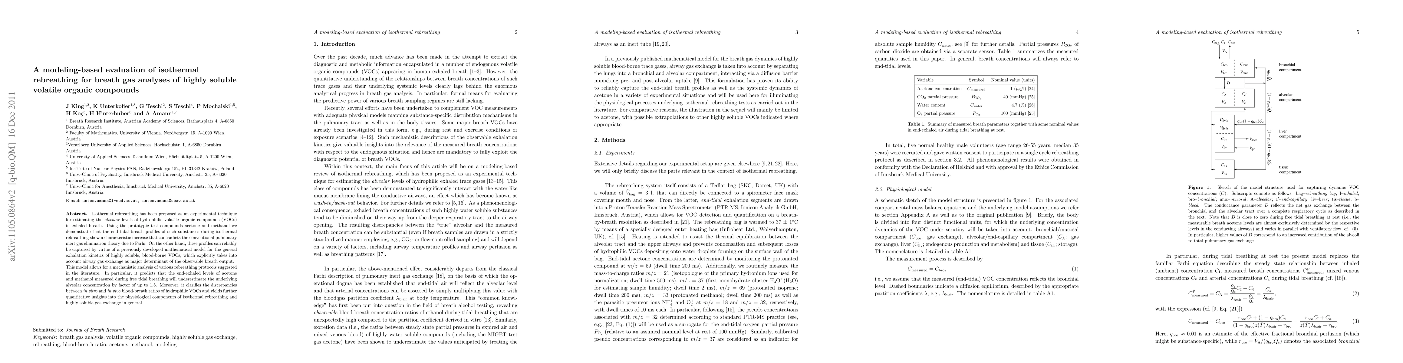 This paper evaluates isothermal rebreathing for analyzing highly soluble volatile organic compounds in exhaled breath, finding that conventional pulmonary inert gas elimination theory does not apply. A mathematical model accurately captures the observed end-tidal breath profiles, providing insights into airway gas exchange and discrepancies in blood-breath ratios.