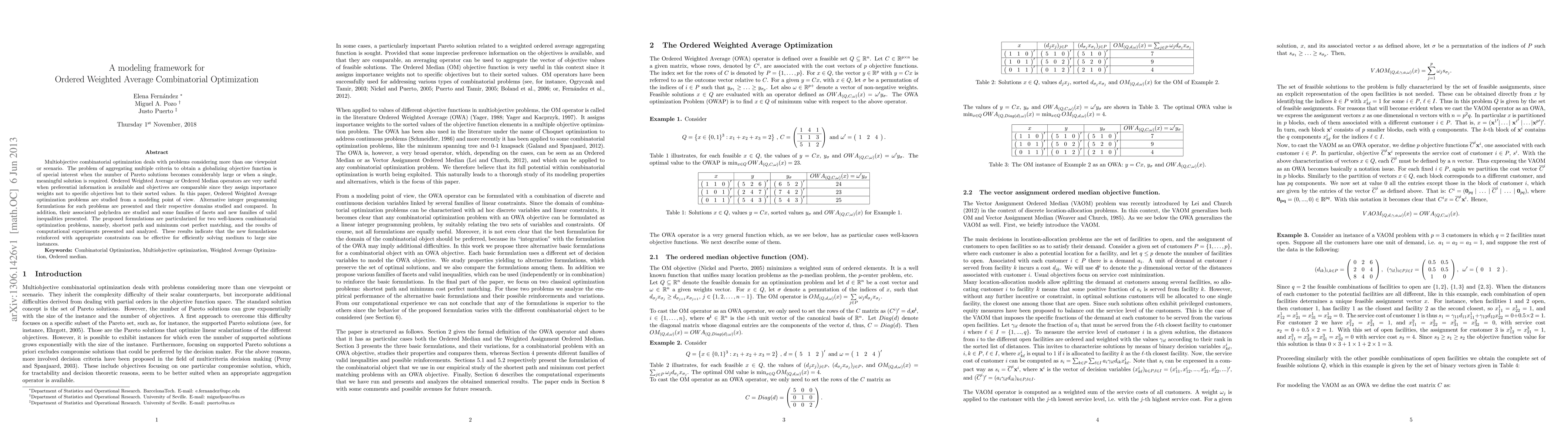 Multiobjective combinatorial optimization deals with problems considering more than one viewpoint or scenario. The problem of aggregating multiple criteria to obtain a globalizing objective function is of special interest when the number of Pareto solutions becomes considerably large or when a single, meaningful solution is required. Ordered Weighted Average or Ordered Median operators are very useful when preferential information is available and objectives are comparable since they assign importance weights not to specific objectives but to their sorted values. In this paper, Ordered Weighted Average optimization problems are studied from a modeling point of view. Alternative integer programming formulations for such problems are presented and their respective domains studied and compared. In addition, their associated polyhedra are studied and some families of facets and new families of valid inequalities presented. The proposed formulations are particularized for two well-known combinatorial optimization problems, namely, shortest path and minimum cost perfect matching, and the results of computational experiments presented and analyzed. These results indicate that the new formulations reinforced with appropriate constraints can be effective for efficiently solving medium to large size instances.
