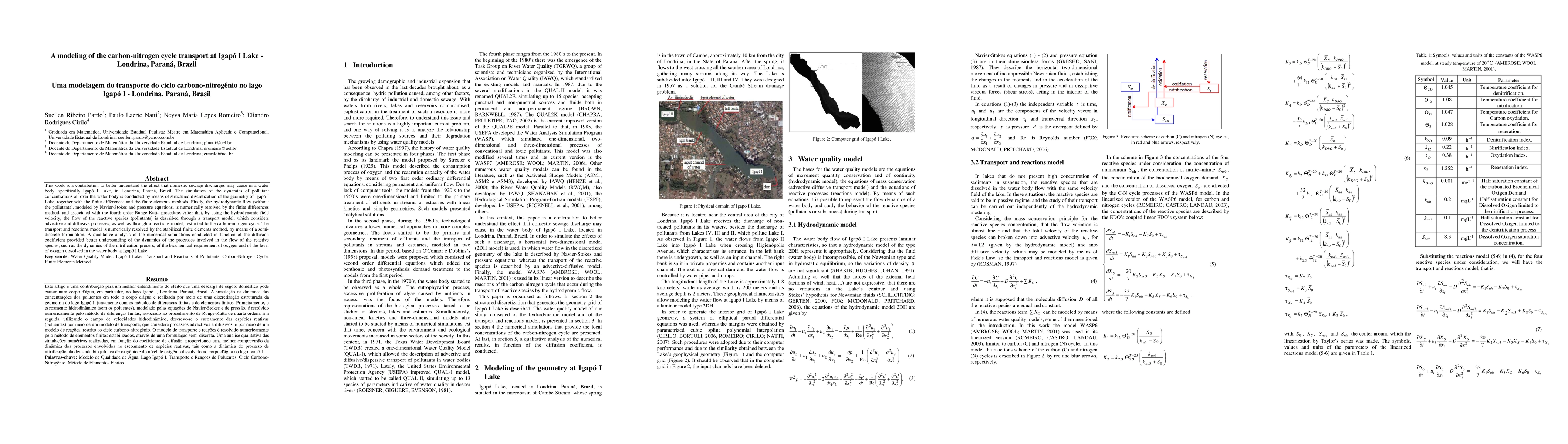 This study models the carbon-nitrogen cycle transport in Igapo I Lake, Londrina, Brazil, to understand the impact of domestic sewage. Using finite differences and elements methods, it simulates pollutant dynamics, considering hydrodynamic flow, advective and diffusive processes, and carbon-nitrogen cycle reactions. The model aids in understanding nitrification, oxygen requirements, and dissolved oxygen levels in the lake.