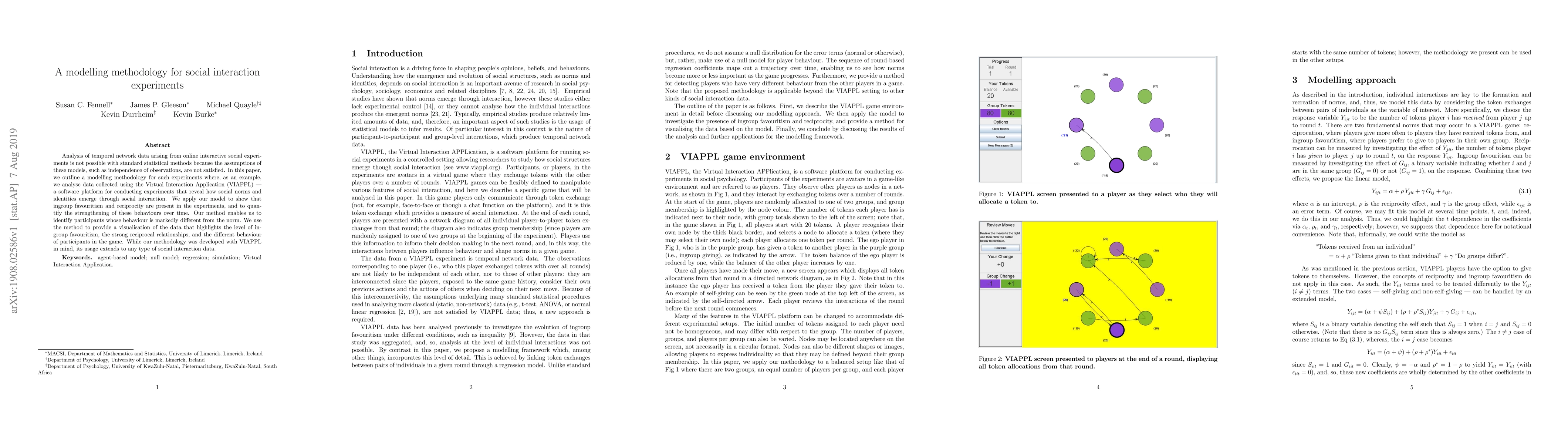 Analysis of temporal network data arising from online interactive social experiments is not possible with standard statistical methods because the assumptions of these models, such as independence of observations, are not satisfied. In this paper, we outline a modelling methodology for such experiments where, as an example, we analyse data collected using the Virtual Interaction Application (VIAPPL) --- a software platform for conducting experiments that reveal how social norms and identities emerge through social interaction. We apply our model to show that ingroup favouritism and reciprocity are present in the experiments, and to quantify the strengthening of these behaviours over time. Our method enables us to identify participants whose behaviour is markedly different from the norm. We use the method to provide a visualisation of the data that highlights the level of ingroup favouritism, the strong reciprocal relationships, and the different behaviour of participants in the game. While our methodology was developed with VIAPPL in mind, its usage extends to any type of social interaction data.