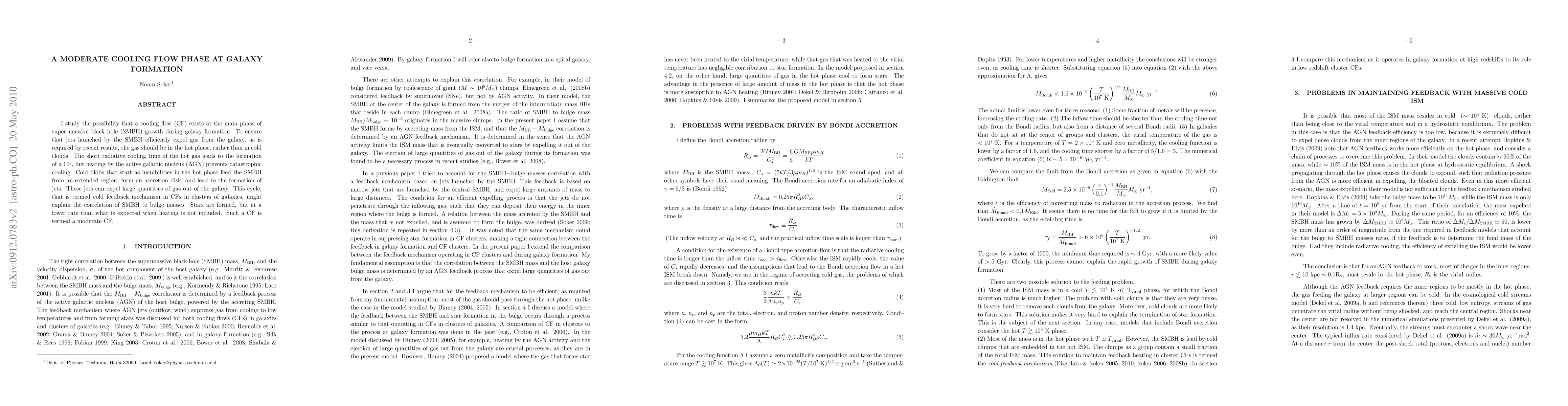 I study the possibility that a cooling flow (CF) exists at the main phase of super massive black hole (SMBH) growth during galaxy formation. To ensure that jets launched by the SMBH efficiently expel gas from the galaxy, as is required by recent results, the gas should be in the hot phase, rather than in cold clouds. The short radiative cooling time of the hot gas leads to the formation of a CF, but heating by the active galactic nucleus (AGN) prevents catastrophic cooling. Cold blobs that start as instabilities in the hot phase feed the SMBH from an extended region, form an accretion disk, and lead to the formation of jets. These jets can expel large quantities of gas out of the galaxy. This cycle, that is termed cold feedback mechanism in CFs in clusters of galaxies, might explain the correlation of SMBH to bulge masses. Stars are formed, but at a lower rate than what is expected when heating is not included. Such a CF is termed a moderate CF.