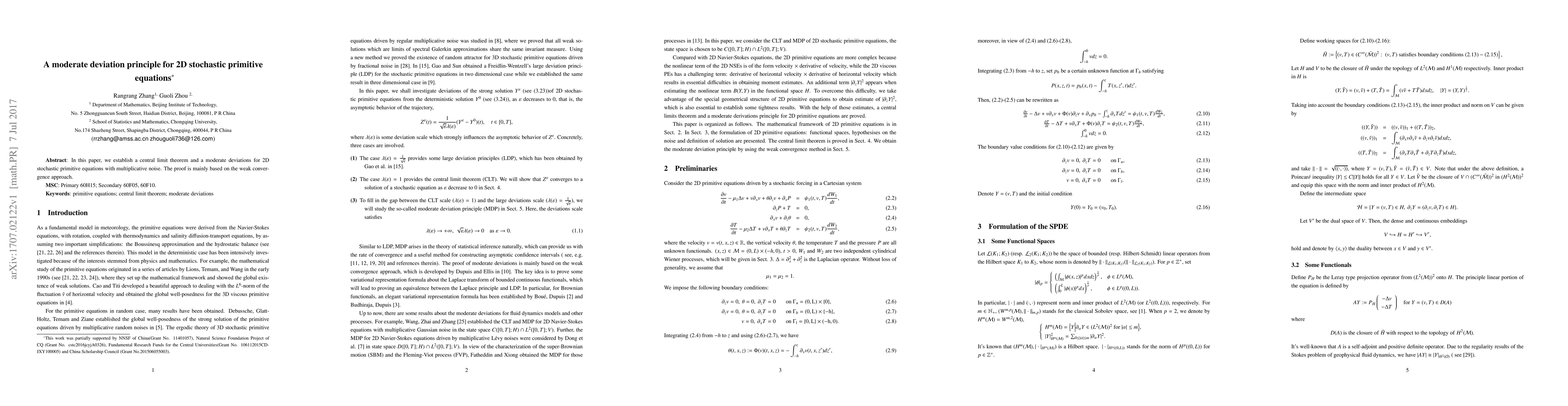 Summary: This paper establishes a central limit theorem and moderate deviation principles for 2D stochastic primitive equations under multiplicative noise, utilizing a weak convergence approach for the proof.