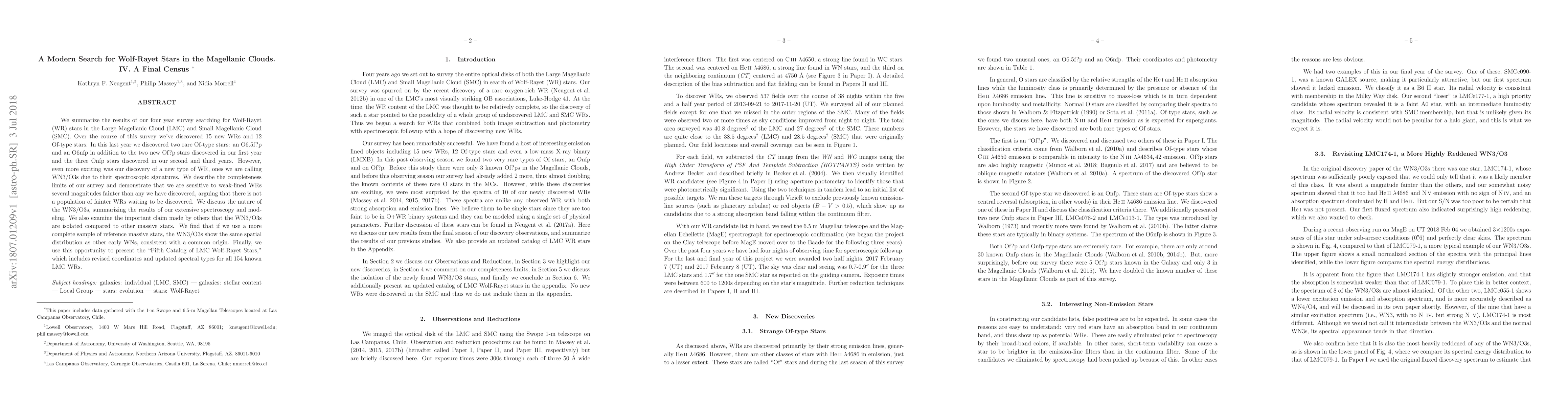 We summarize the results of our four year survey searching for Wolf-Rayet (WR) stars in the Large Magellanic Cloud (LMC) and Small Magellanic Cloud (SMC). Over the course of this survey we've discovered 15 new WRs and 12 Of-type stars. In this last year we discovered two rare Of-type stars: an O6.5f?p and an O6nfp in addition to the two new Of?p stars discovered in our first year and the three Onfp stars discovered in our second and third years. However, even more exciting was our discovery of a new type of WR, ones we are calling WN3/O3s due to their spectroscopic signatures. We describe the completeness limits of our survey and demonstrate that we are sensitive to weak-lined WRs several magnitudes fainter than any we have discovered, arguing that there is not a population of fainter WRs waiting to be discovered. We discuss the nature of the WN3/O3s, summarizing the results of our extensive spectroscopy and modeling. We also examine the important claim made by others that the WN3/O3s are isolated compared to other massive stars. We find that if we use a more complete sample of reference massive stars, the WN3/O3s show the same spatial distribution as other early WNs, consistent with a common origin. Finally, we use this opportunity to present the "Fifth Catalog of LMC Wolf-Rayet Stars," which includes revised coordinates and updated spectral types for all 154 known LMC WRs.