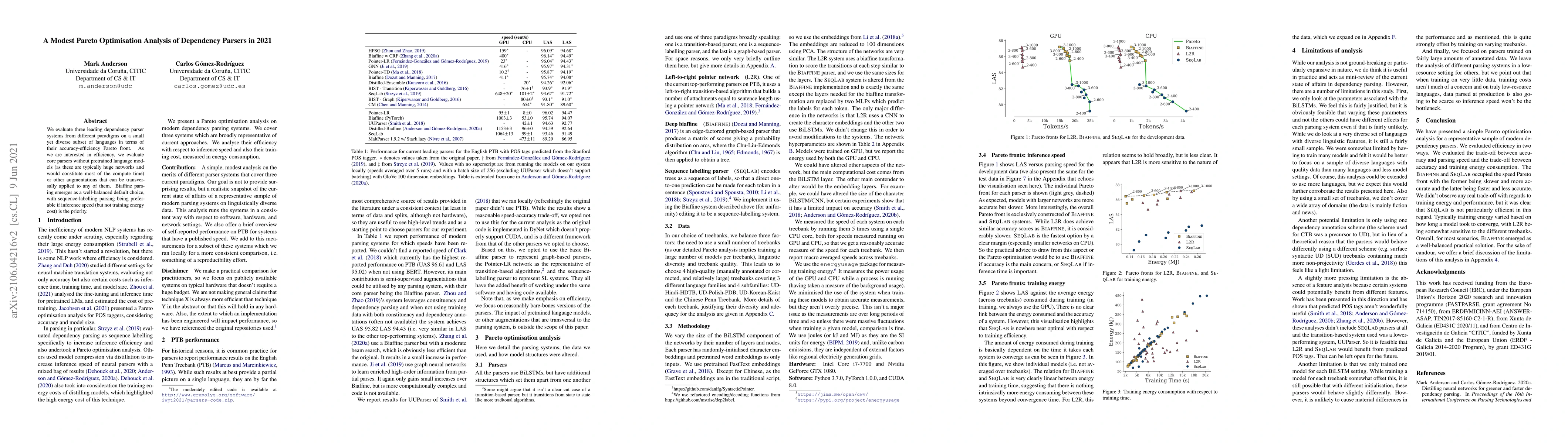 We evaluate three leading dependency parser systems from different paradigms on a small yet diverse subset of languages in terms of their accuracy-efficiency Pareto front. As we are interested in efficiency, we evaluate core parsers without pretrained language models (as these are typically huge networks and would constitute most of the compute time) or other augmentations that can be transversally applied to any of them. Biaffine parsing emerges as a well-balanced default choice, with sequence-labelling parsing being preferable if inference speed (but not training energy cost) is the priority.