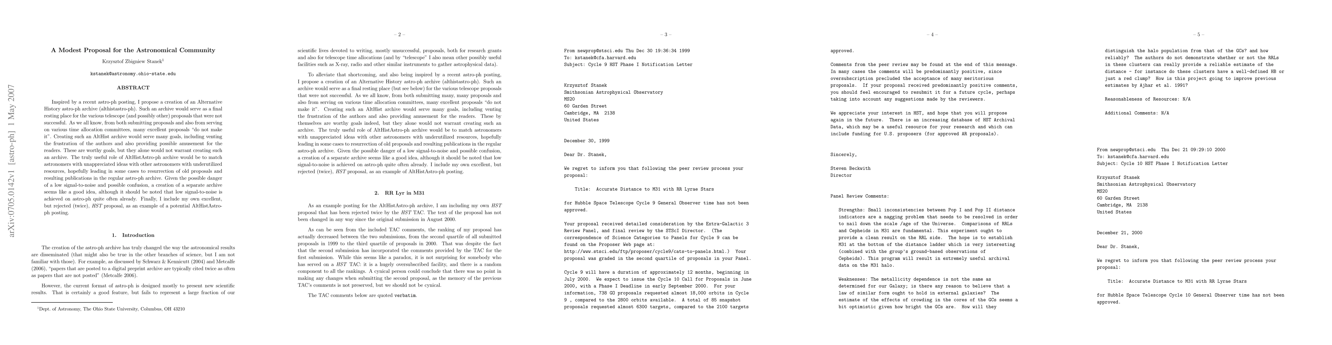 Inspired by a recent astro-ph posting, I propose a creation of an Alternative History astro-ph archive (althistastro-ph). Such an archive would serve as a final resting place for the various telescope (and possibly other) proposals that were not successful. As we all know, from both submitting proposals and also from serving on various time allocation committees, many excellent proposals ``do not make it''. Creating such an AltHist archive would serve many goals, including venting the frustration of the authors and also providing possible amusement for the readers. These are worthy goals, but they alone would not warrant creating such an archive. The truly useful role of AltHistAstro-ph archive would be to match astronomers with unappreciated ideas with other astronomers with underutilized resources, hopefully leading in some cases to resurrection of old proposals and resulting publications in the regular astro-ph archive. Given the possible danger of a low signal-to-noise and possible confusion, a creation of a separate archive seems like a good idea, although it should be noted that low signal-to-noise is achieved on astro-ph quite often already. Finally, I include my own excellent, but rejected (twice), HST proposal, as an example of a potential AltHistAstro-ph posting.