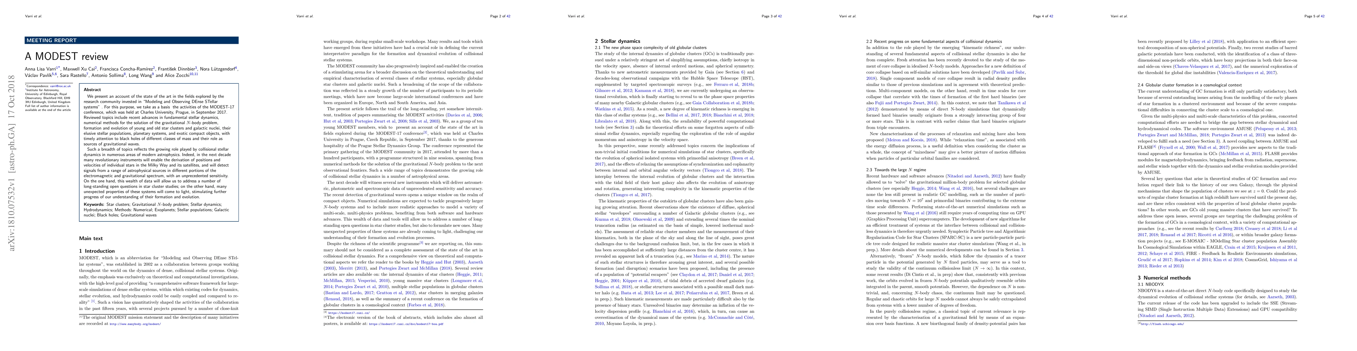 We present an account of the state of the art in the fields explored by the research community invested in 'Modeling and Observing DEnse STellar systems'. For this purpose, we take as a basis the activities of the MODEST-17 conference, which was held at Charles University, Prague, in September 2017. Reviewed topics include recent advances in fundamental stellar dynamics, numerical methods for the solution of the gravitational N-body problem, formation and evolution of young and old star clusters and galactic nuclei, their elusive stellar populations, planetary systems, and exotic compact objects, with timely attention to black holes of different classes of mass and their role as sources of gravitational waves. Such a breadth of topics reflects the growing role played by collisional stellar dynamics in numerous areas of modern astrophysics. Indeed, in the next decade, many revolutionary instruments will enable the derivation of positions and velocities of individual stars in the Milky Way and its satellites and will detect signals from a range of astrophysical sources in different portions of the electromagnetic and gravitational spectrum, with an unprecedented sensitivity. On the one hand, this wealth of data will allow us to address a number of long-standing open questions in star cluster studies; on the other hand, many unexpected properties of these systems will come to light, stimulating further progress of our understanding of their formation and evolution.