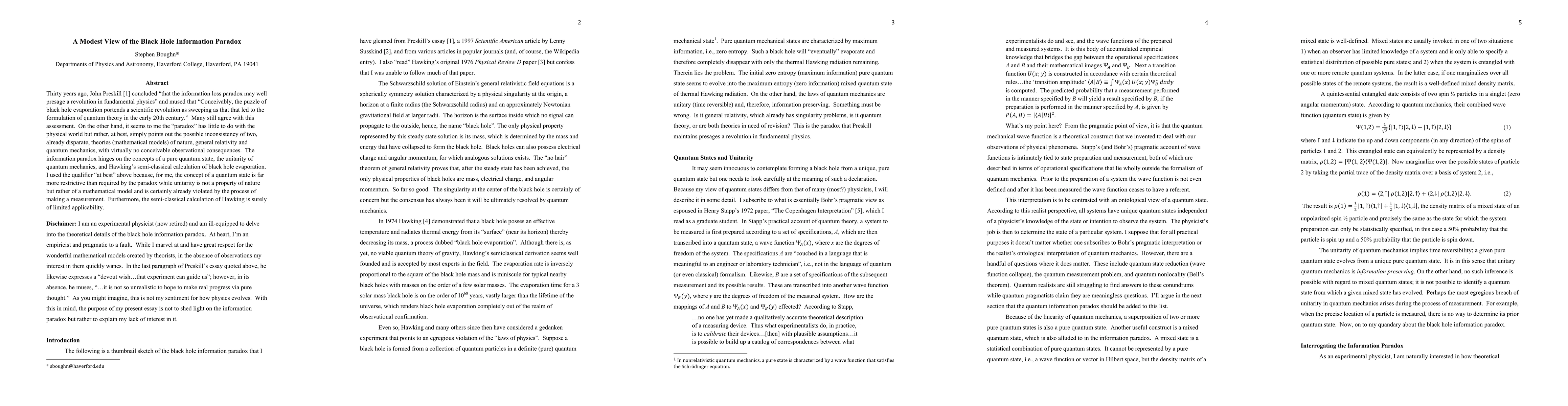 Thirty years ago, John Preskill concluded "that the information loss paradox may well presage a revolution in fundamental physics" and mused that "Conceivably, the puzzle of black hole evaporation portends a scientific revolution as sweeping as that that led to the formulation of quantum theory in the early 20th century." Many still agree with this assessment. On the other hand, it seems to me the "paradox" has little to do with the physical world but rather, at best, simply points out the possible inconsistency of two, already disparate, theories (mathematical models) of nature, general relativity and quantum mechanics, with virtually no conceivable observational consequences. The information paradox hinges on the concepts of a pure quantum state, the unitarity of quantum mechanics, and Hawking's semi-classical calculation of black hole evaporation. I used the qualifier "at best" above because, for me, the concept of a quantum state is far more restrictive than required by the paradox while unitarity is not a property of nature but rather of a mathematical model and is already violated by the process of making a measurement. Furthermore, the semi-classical calculation of Hawking is surely of limited applicability.