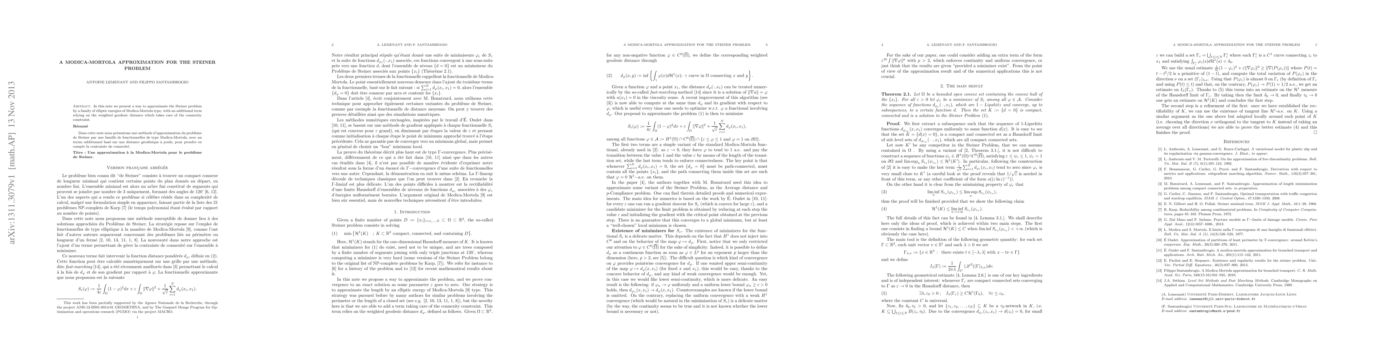 In this note we present a way to approximate the Steiner problem by a family of elliptic energies of Modica-Mortola type, with an additional term relying on the weighted geodesic distance which takes care of the connexity constraint.