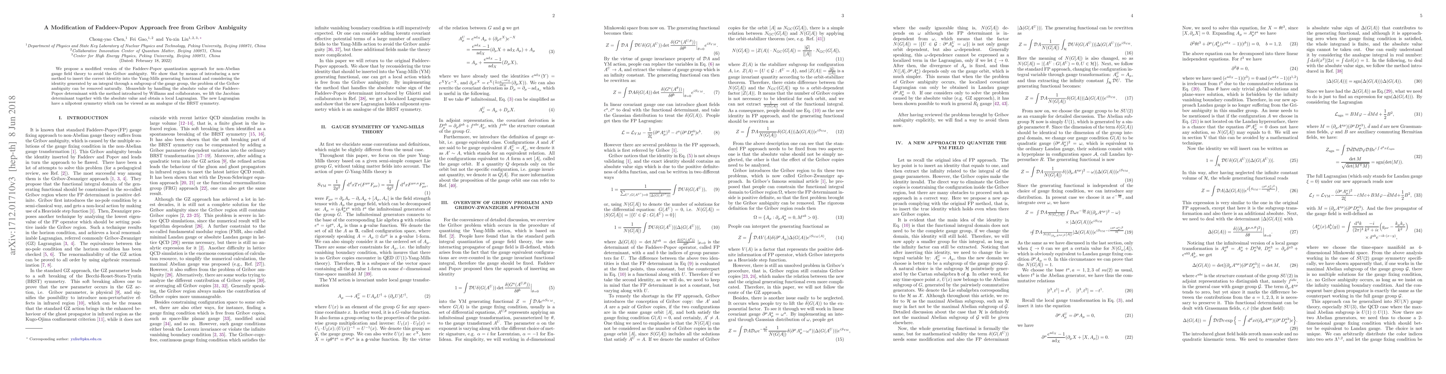 This paper proposes a modified Faddeev-Popov approach to non-Abelian gauge theory that eliminates Gribov ambiguity by introducing a new method to insert the correct identity into the Yang-Mills generating functional. It also leverages Williams' method to handle the Faddeev-Popov determinant, resulting in a local Lagrangian with a nilpotent symmetry akin to BRST symmetry.