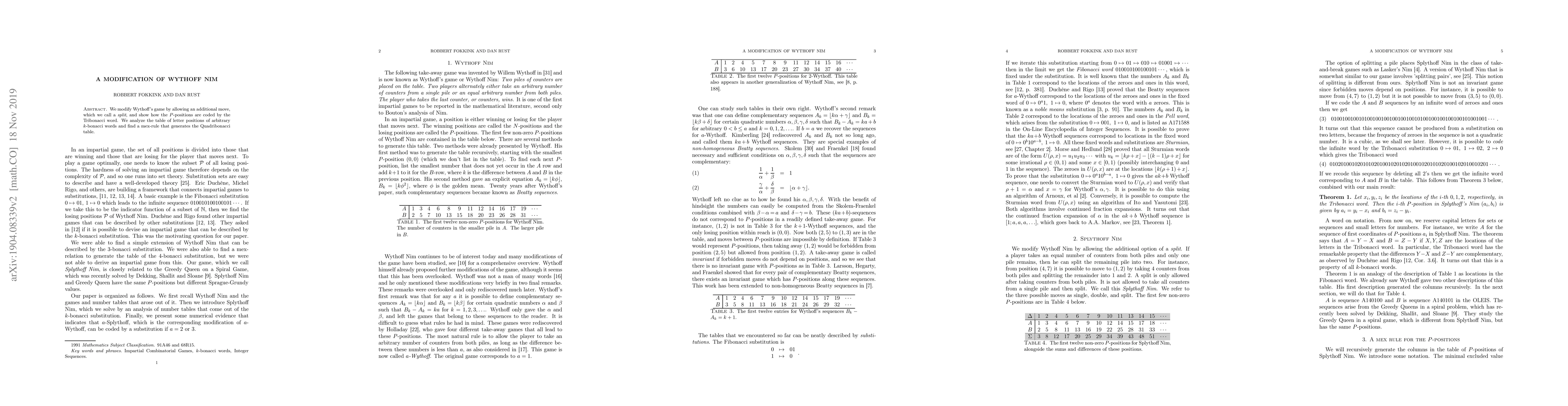 We modify Wythoff's game by allowing an additional move, which we call a "split", and show how the $P$-positions are coded by the Tribonacci word. We analyze the table of letter positions of arbitrary $k$-bonacci words and find a $\mathrm{mex}$-rule that generates the Quadribonacci table.