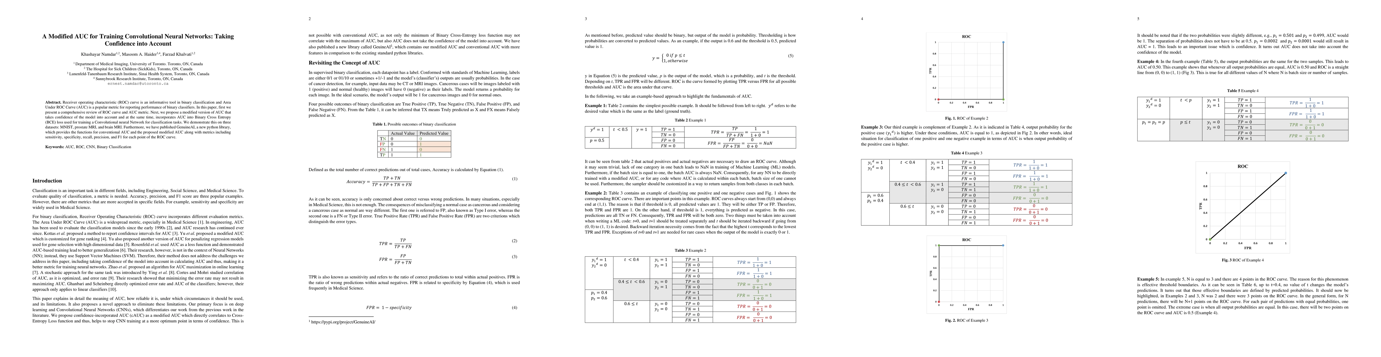 Receiver operating characteristic (ROC) curve is an informative tool in binary classification and Area Under ROC Curve (AUC) is a popular metric for reporting performance of binary classifiers. In this paper, first we present a comprehensive review of ROC curve and AUC metric. Next, we propose a modified version of AUC that takes confidence of the model into account and at the same time, incorporates AUC into Binary Cross Entropy (BCE) loss used for training a Convolutional neural Network for classification tasks. We demonstrate this on three datasets: MNIST, prostate MRI, and brain MRI. Furthermore, we have published GenuineAI, a new python library, which provides the functions for conventional AUC and the proposed modified AUC along with metrics including sensitivity, specificity, recall, precision, and F1 for each point of the ROC curve.