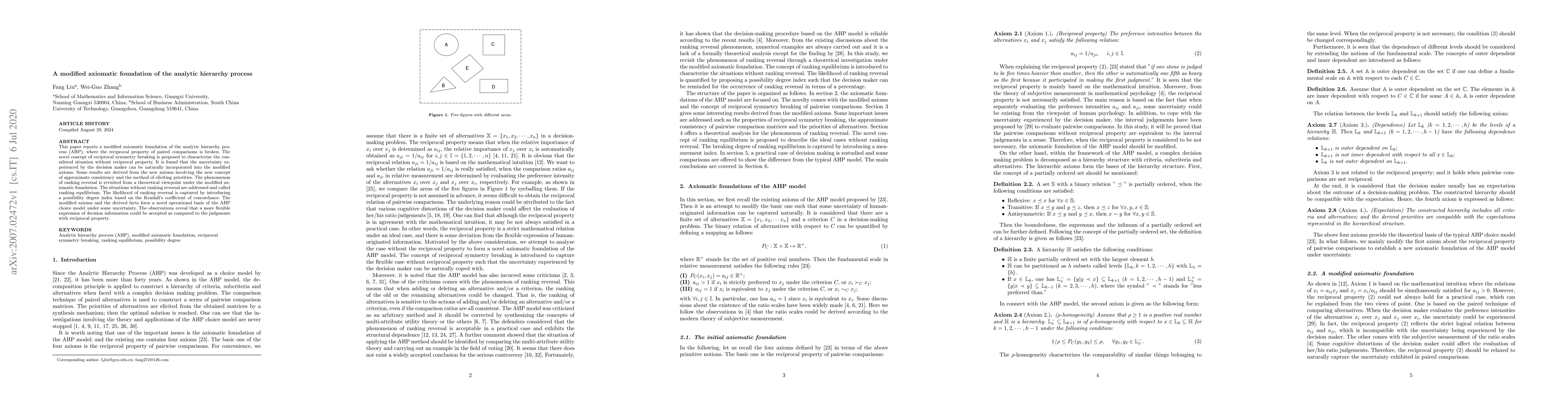 This paper reports a modified axiomatic foundation of the analytic hierarchy process (AHP), where the reciprocal property of paired comparisons is broken. The novel concept of reciprocal symmetry breaking is proposed to characterize the considered situation without reciprocal property. It is found that the uncertainty experienced by the decision maker can be naturally incorporated into the modified axioms. Some results are derived from the new axioms involving the new concept of approximate consistency and the method of eliciting priorities. The phenomenon of ranking reversal is revisited from a theoretical viewpoint under the modified axiomatic foundation. The situations without ranking reversal are addressed and called ranking equilibrium. The likelihood of ranking reversal is captured by introducing a possibility degree index based on the Kendall's coefficient of concordance. The modified axioms and the derived facts form a novel operational basis of the AHP choice model under some uncertainty. The observations reveal that a more flexible expression of decision information could be accepted as compared to the judgments with reciprocal property.