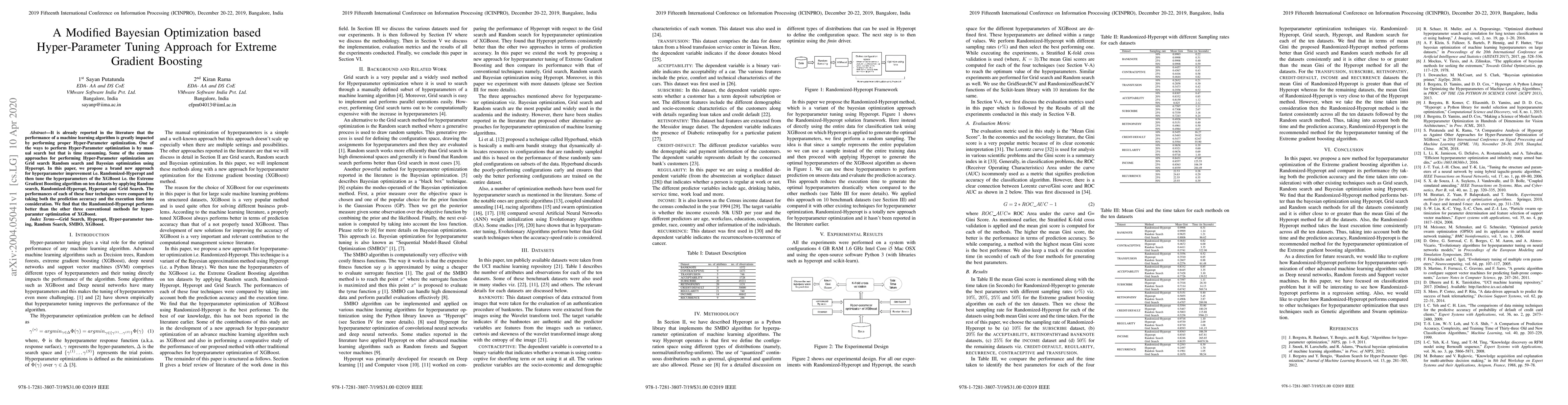 It is already reported in the literature that the performance of a machine learning algorithm is greatly impacted by performing proper Hyper-Parameter optimization. One of the ways to perform Hyper-Parameter optimization is by manual search but that is time consuming. Some of the common approaches for performing Hyper-Parameter optimization are Grid search Random search and Bayesian optimization using Hyperopt. In this paper, we propose a brand new approach for hyperparameter improvement i.e. Randomized-Hyperopt and then tune the hyperparameters of the XGBoost i.e. the Extreme Gradient Boosting algorithm on ten datasets by applying Random search, Randomized-Hyperopt, Hyperopt and Grid Search. The performances of each of these four techniques were compared by taking both the prediction accuracy and the execution time into consideration. We find that the Randomized-Hyperopt performs better than the other three conventional methods for hyper-paramter optimization of XGBoost.