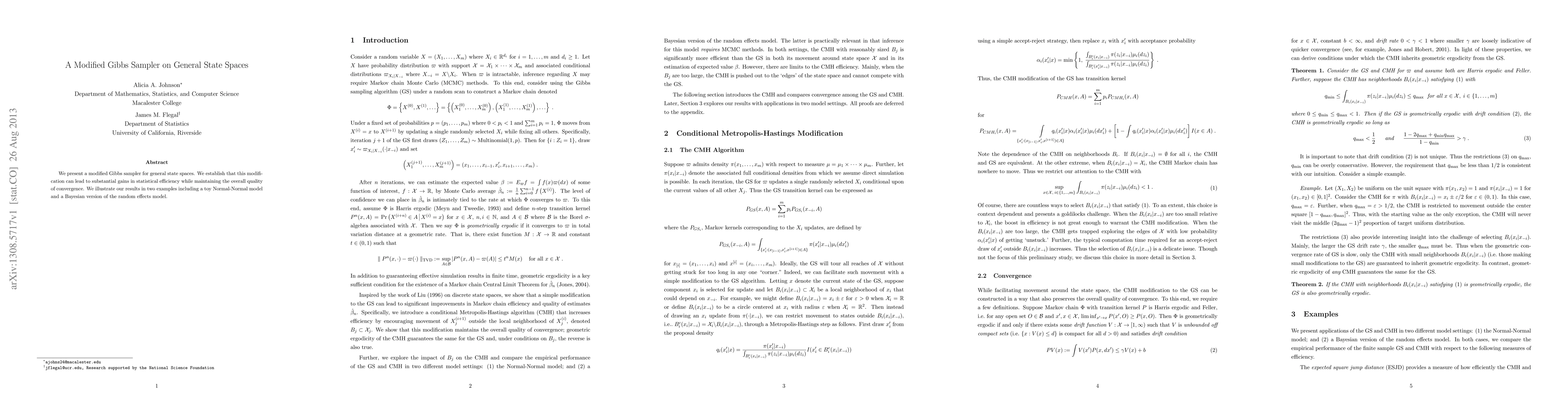 A modified Gibbs sampler is proposed for general state spaces, showing substantial gains in statistical efficiency while maintaining convergence quality, illustrated through two examples.
