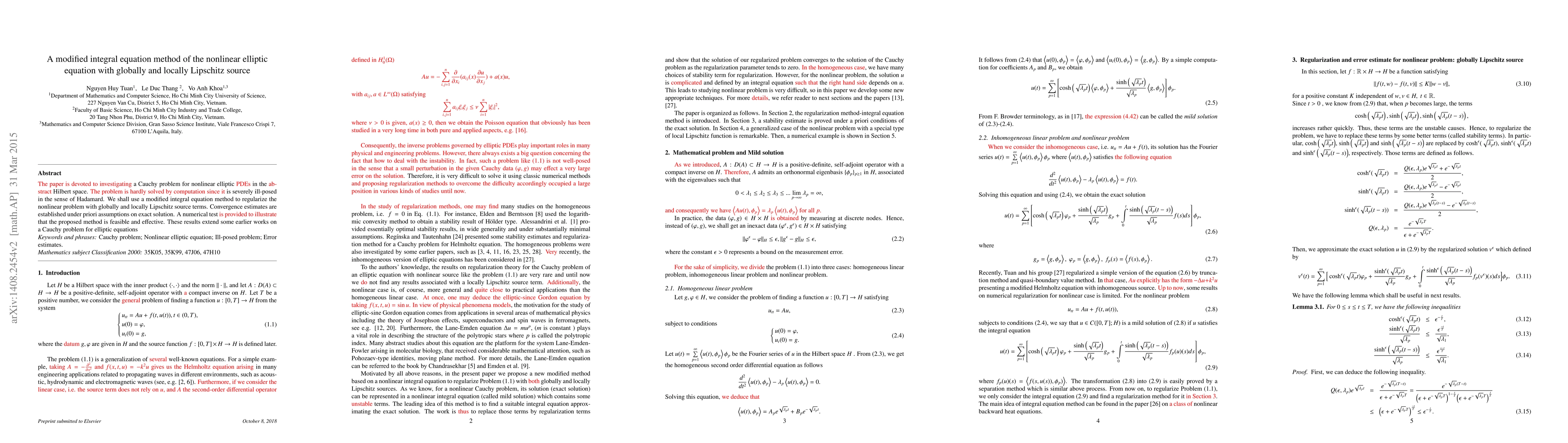 The paper is devoted to investigating a Cauchy problem for nonlinear elliptic PDEs in the abstract Hilbert space. The problem is hardly solved by computation since it is severely ill-posed in the sense of Hadamard. We shall use a modified integral equation method to regularize the nonlinear problem with globally and locally Lipschitz source terms. Convergence estimates are established under priori assumptions on exact solution. A numerical test is provided to illustrate that the proposed method is feasible and effective. These results extend some earlier works on a Cauchy problem for elliptic equations.