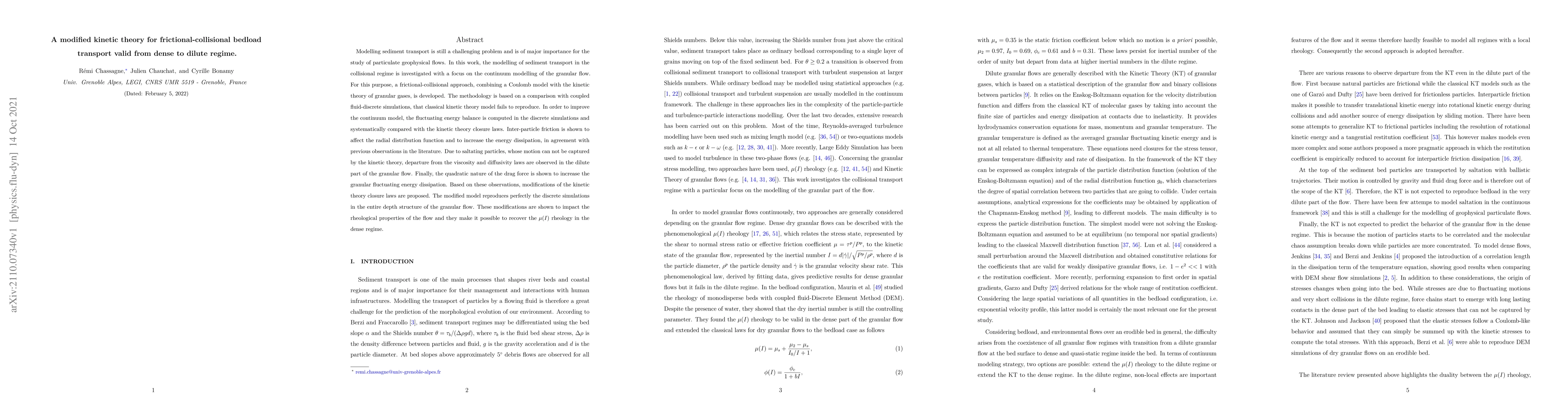 Modelling sediment transport is still a challenging problem and is of major importance for the study of particulate geophysical flows. In this work, the modelling of sediment transport in the collisional regime is investigated with a focus on the continuum modelling of the granular flow. For this purpose, a frictional-collisional approach, combining a Coulomb model with the kinetic theory of granular gases, is developed. The methodology is based on a comparison with coupled fluid-discrete simulations, that classical kinetic theory model fails to reproduce. In order to improve the continuum model, the fluctuating energy balance is computed in the discrete simulations and systematically compared with the kinetic theory closure laws. Inter-particle friction is shown to affect the radial distribution function and to increase the energy dissipation, in agreement with previous observations in the literature. Due to saltating particles, whose motion can not be captured by the kinetic theory, departure from the viscosity and diffusivity laws are observed in the dilute part of the granular flow. Finally, the quadratic nature of the drag force is shown to increase the granular fluctuating energy dissipation. Based on these observations, modifications of the kinetic theory closure laws are proposed. The modified model reproduces perfectly the discrete simulations in the entire depth structure of the granular flow. These modifications are shown to impact the rheological properties of the flow and they make it possible to recover the {\mu}(I) rheology in the dense regime.