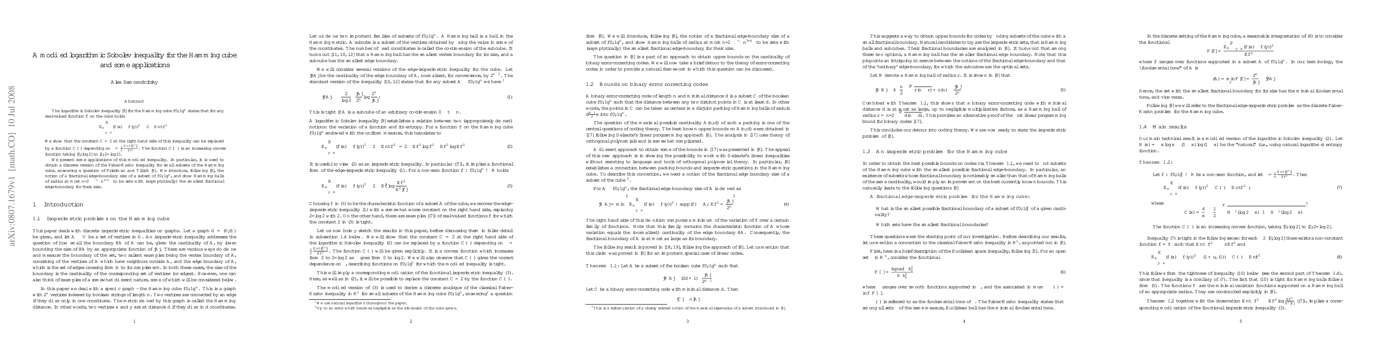 A modified logarithmic Sobolev inequality is introduced for the Hamming cube, replacing a constant with a function depending on entropy values, and shows applications in discrete geometry and coding theory.