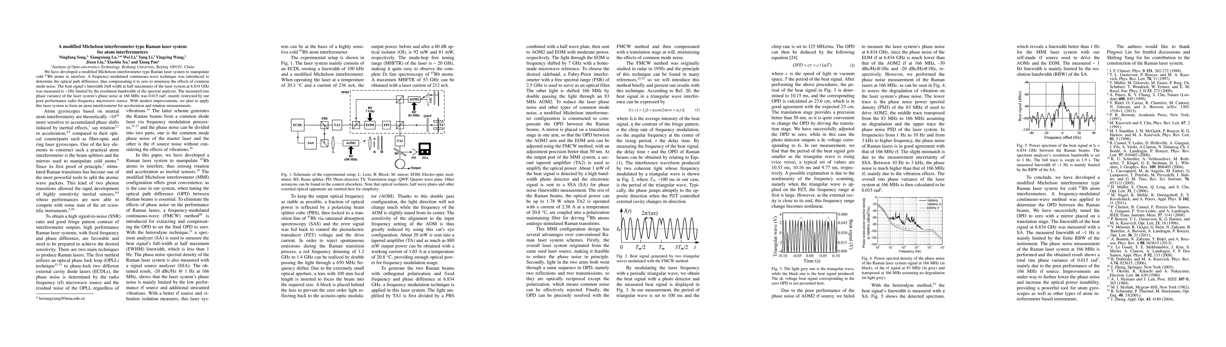 Researchers developed a modified laser system to manipulate cold atoms for interferometry, achieving a 1Hz resolution in the beat signal's linewidth and 0.015 rad2 phase variance.