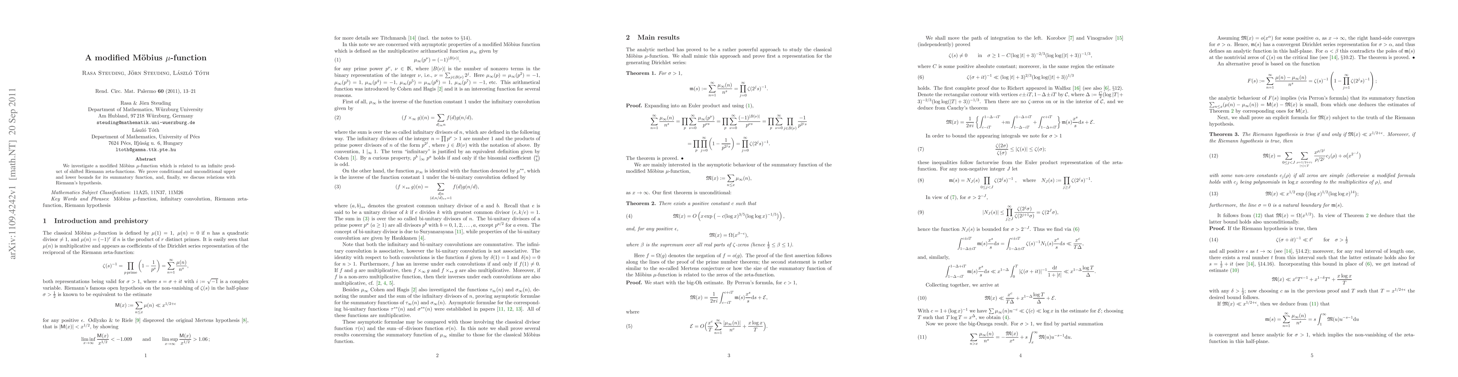 This paper explores a modified M\"obius $\mu$-function linked to an infinite product of shifted Riemann zeta-functions, establishing both conditional and unconditional bounds for its summatory function, and examines its connections to Riemann's hypothesis.