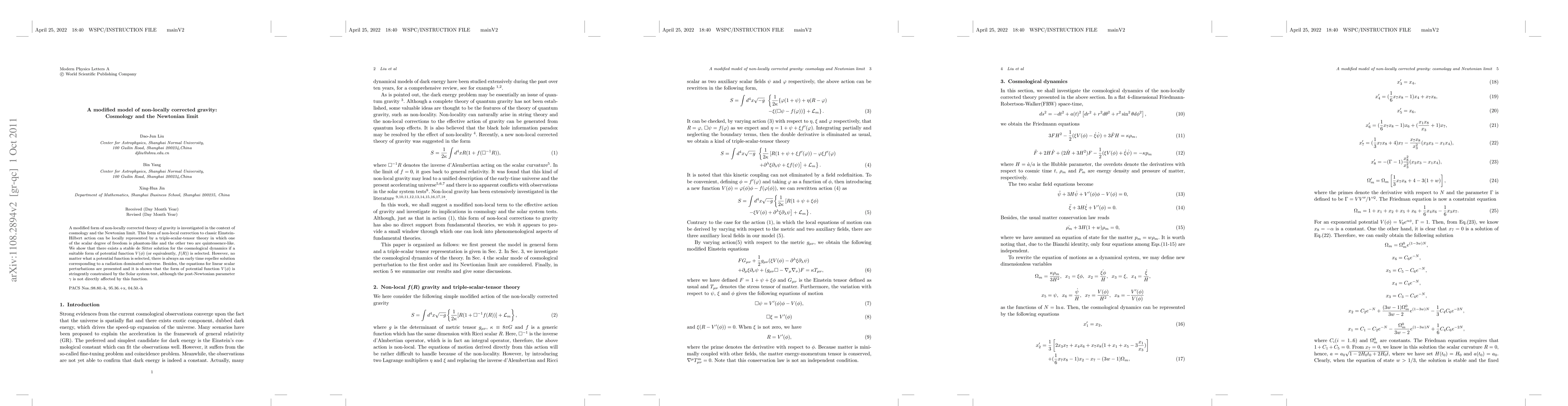 A modified form of non-locally corrected theory of gravity is investigated in the context of cosmology and the Newtonian limit. This form of non-local correction to classic Einstein-Hilbert action can be locally represented by a triple-scalar-tensor theory in which one of the scalar degree of freedom is phantom-like and the other two are quintessence-like. We show that there exists a stable de Sitter solution for the cosmological dynamics if a suitable form of potential function $V(\phi)$ (or equivalently, $f(R)$) is selected. However, no matter what a potential function is selected, there is always an early time repeller solution corresponding to a radiation dominated universe. Besides, the equations for linear scalar perturbations are presented and it is shown that the form of potential function $V(\phi)$ is stringently constrained by the Solar system test, although the post-Newtonian parameter $\gamma$ is not directly affected by this function.