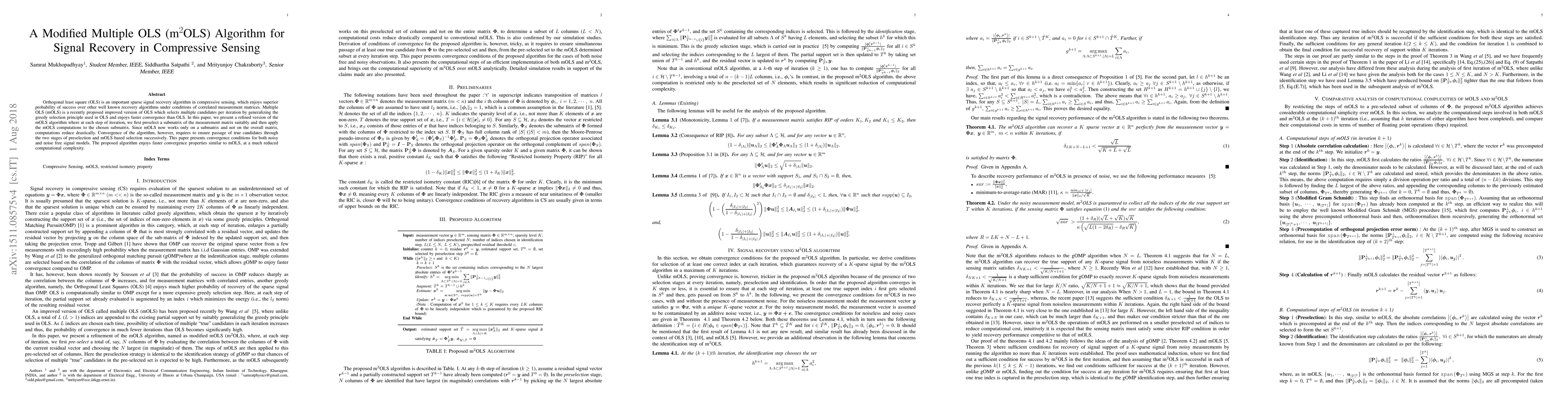 This paper introduces a modified Multiple OLS (m^2OLS) algorithm for signal recovery in Compressive Sensing. The m^2OLS algorithm reduces computational complexity by first preselecting a submatrix of the measurement matrix, then applying mOLS computations to this submatrix, while maintaining faster convergence properties similar to mOLS under specified conditions.